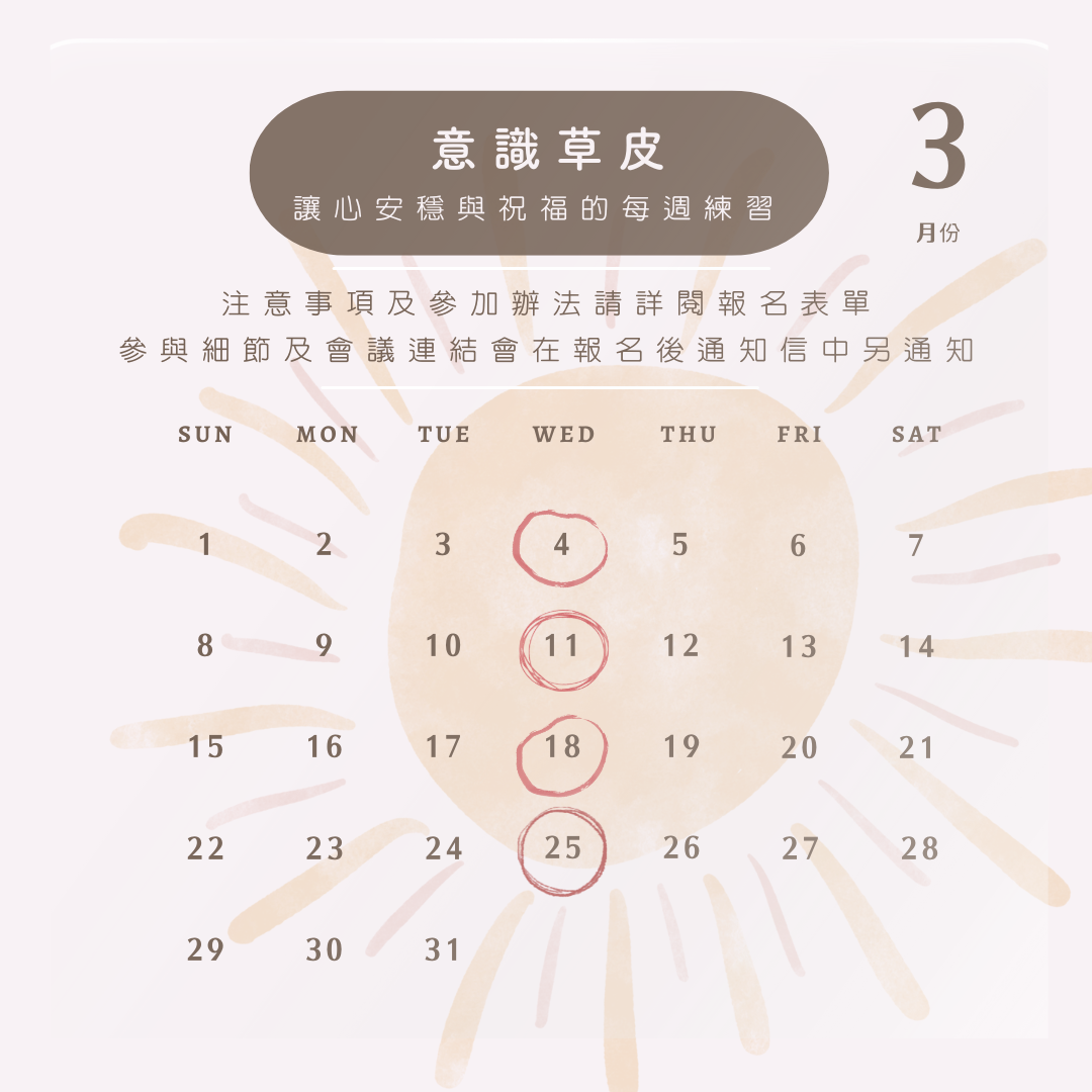 ★ Gmeet系統有時候反應會延遲,建議提早2-3分鐘登入,前4分鐘(20:56)會開放會議室。21:05過後,因已進行活動5分鐘,本活動是漸進式的練習,當場帶領者不能因遲到者而回頭再重複練習,故21:05不再開放進入。