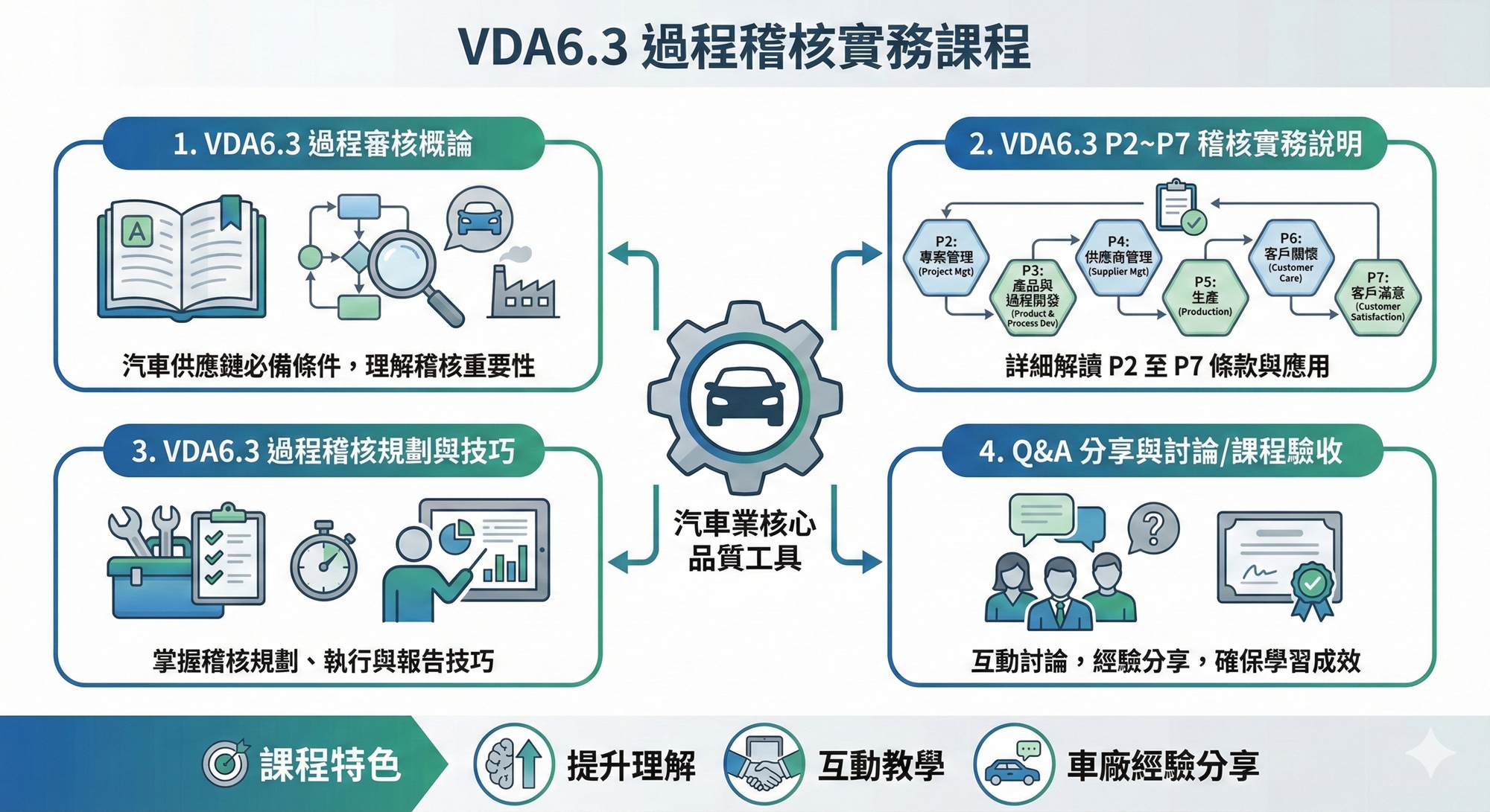 快速掌握最新版標準的核心變動,理解為何「過程稽核」比單純的產品稽核更重要。2. P2~P7 稽核實務精華 🧠: