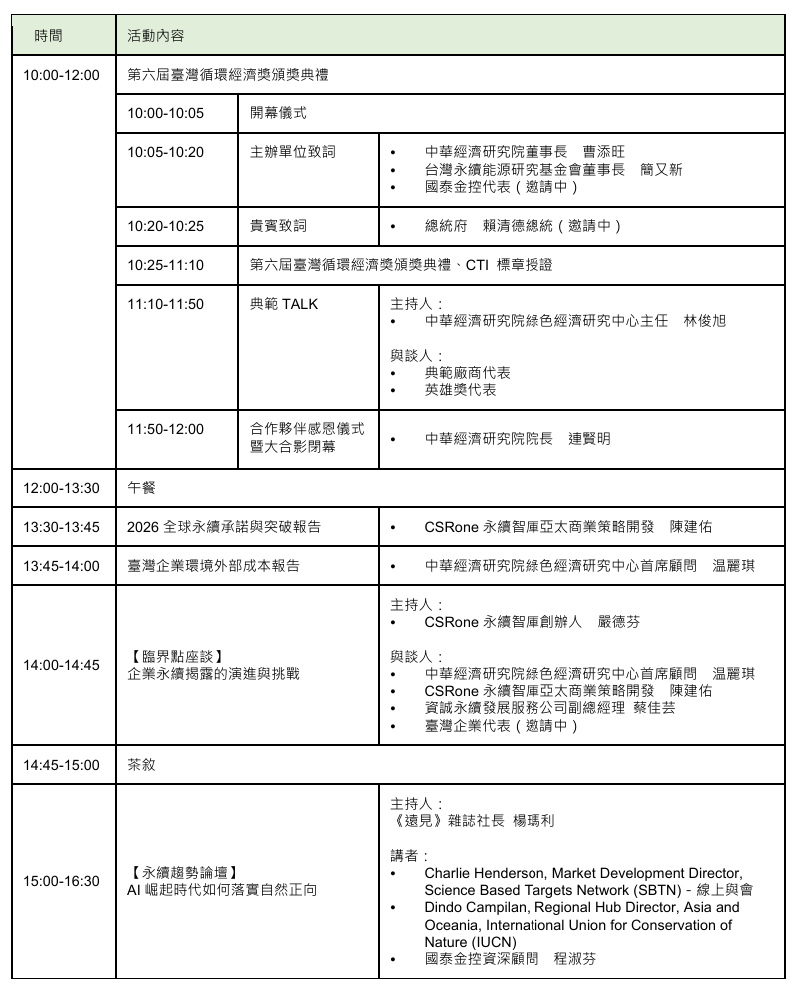 今年,中華經濟研究院、 CSRone 永續智庫、台灣永續能源研究基金會與國泰金控共同舉辦「2026 國際永續峰會」,並以「自然正向的行動時代」為題,重新思考企業如何在與自然共生中創造新價值。活動包含第六屆臺灣循環經濟獎頒獎典禮與永續趨勢論壇,並將發表全新旗艦研究報告《臨界點:全球永續承諾與突破報告 2026》。匯集國內外貴賓與企業代表,以數據、案例與國際觀點,展現企業如何在全球永續轉型中,堅持築基,持續前行。