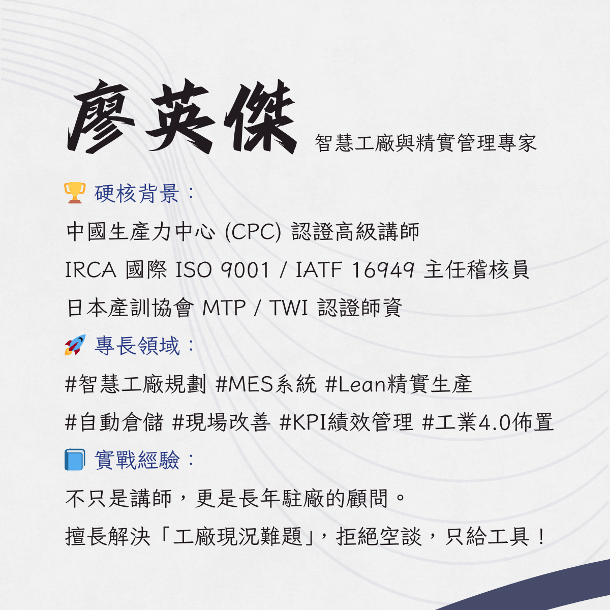 曾任 CPC 顧問師班第一名結訓,廖老師深知基層幹部的痛,用日本產訓協會認證的專業,手把手帶出高效團隊。