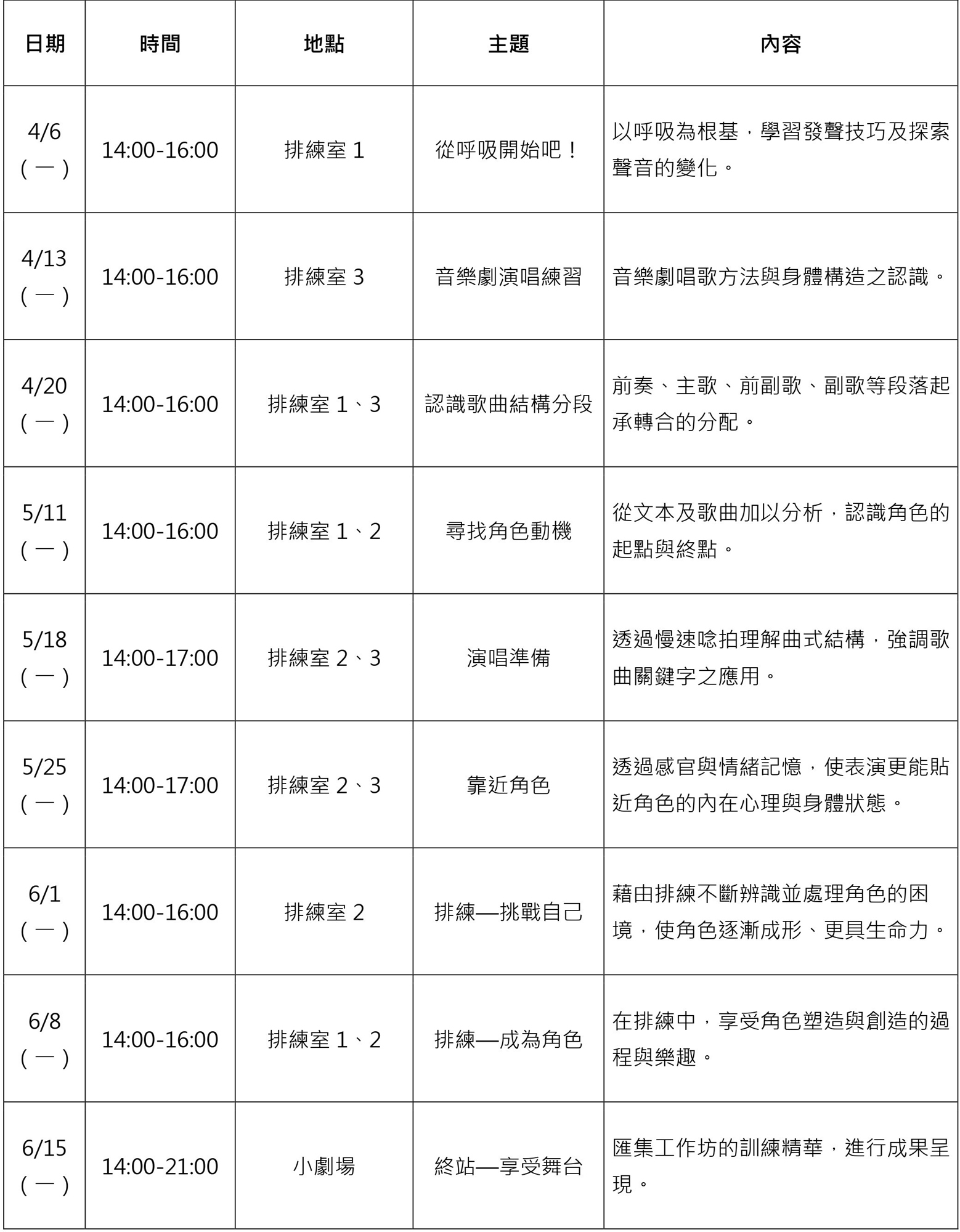 音樂劇表演者最大的挑戰,莫過於聲音、肢體與情感渾然天成地表達。儘管曾經受過各類聲音、肢體的訓練,在表演時仍覺得難以將演、歌、舞合而為一?今年音樂劇工作坊再度邀請兼具表演、舞蹈與聲音訓練背景的張擎佳擔任講師,帶領學員走進完整的音樂劇表演世界,陪伴大家在排練過程中一次次的挑戰自己。工作坊選用音樂劇《麗晶卡拉OK的最後一夜》、《神明便利商店》、《DAYLIGHT》以及《北斗星下的大煙囪》中的曲目,並加入華語、臺語的戲劇段落,讓學員體驗音樂劇在不同語言中所呈現的獨特韻律與魅力。最後的學習成果將於小劇場舞台呈現,邀請親朋好友一起感受音樂劇帶來的感動與快樂。