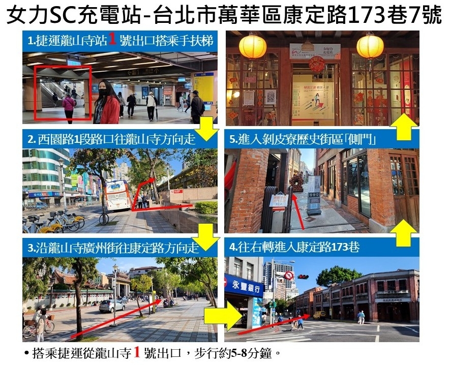 龍山寺捷運站捷運站 1號 出口,步行約5-8分鐘,如下圖所示。