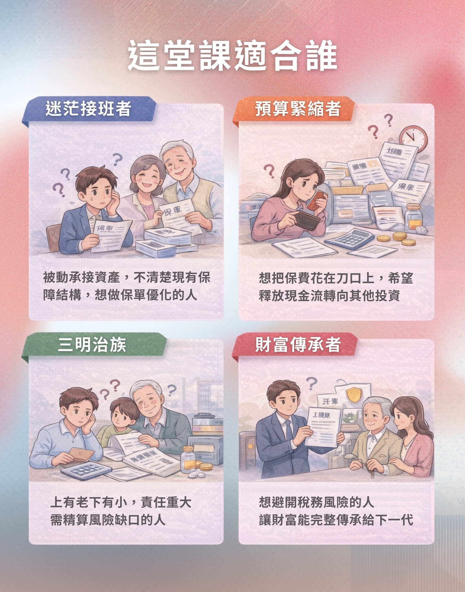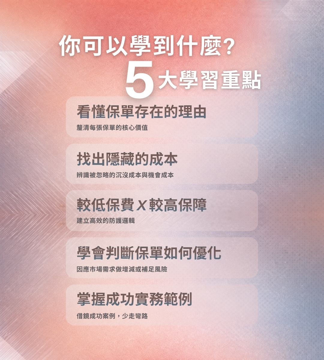 這正是這堂課的價值!我們會分享保險配置的觀念和案例,幫你把遺忘、不知道的保單通通找回來