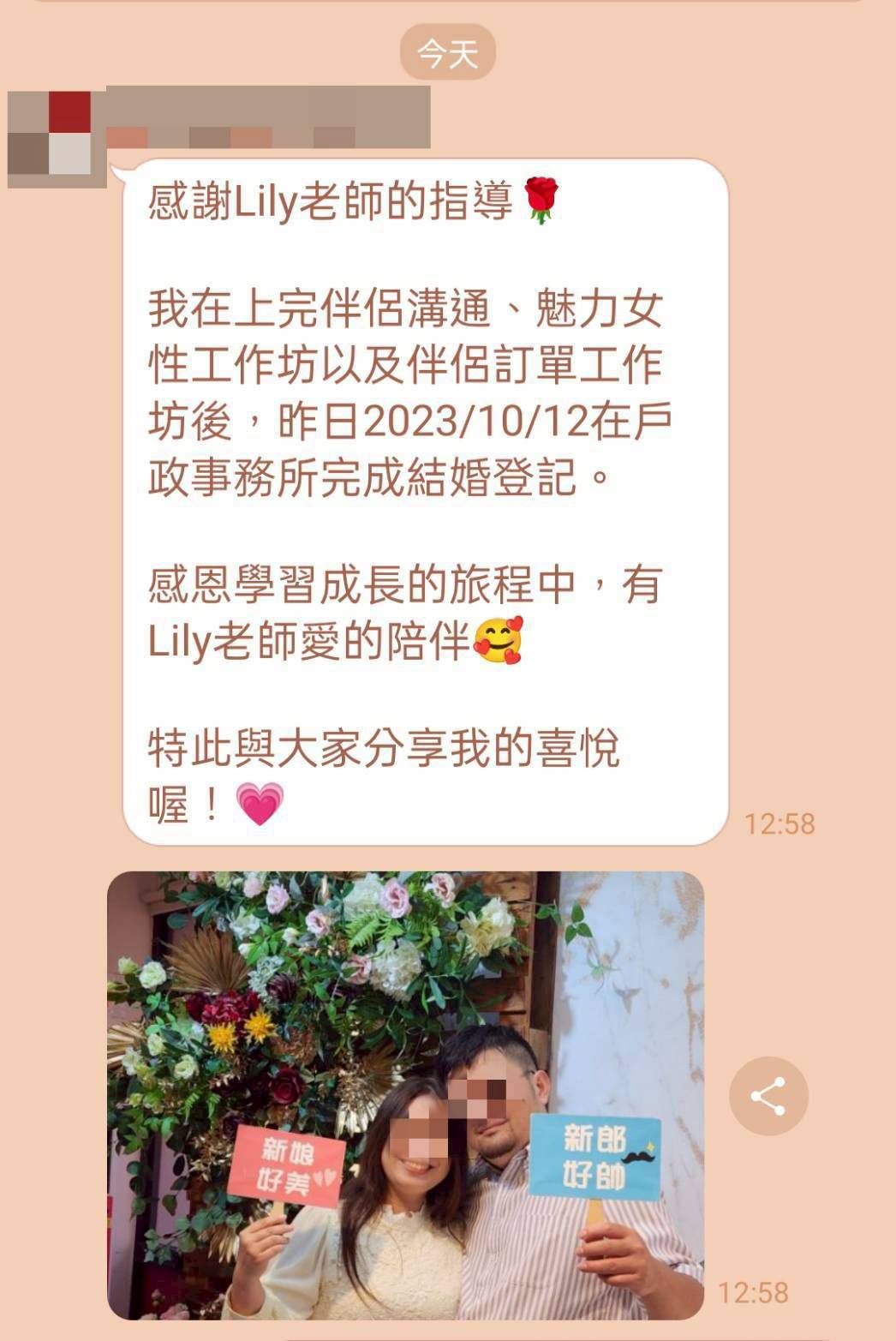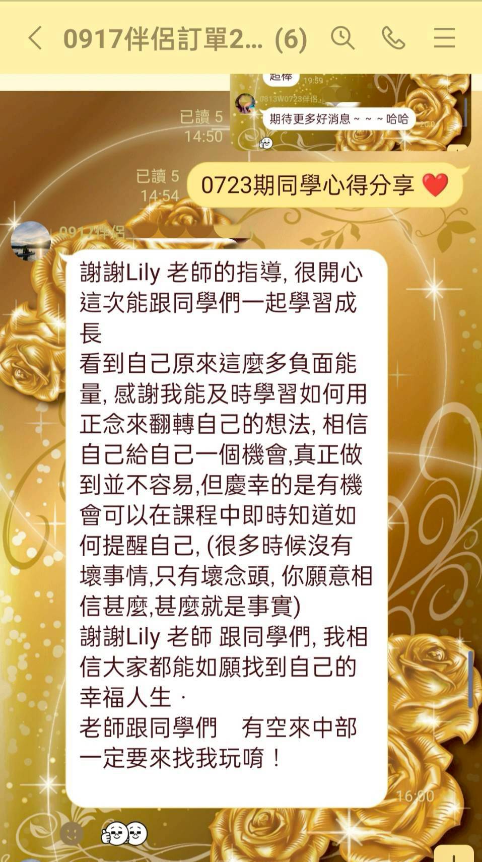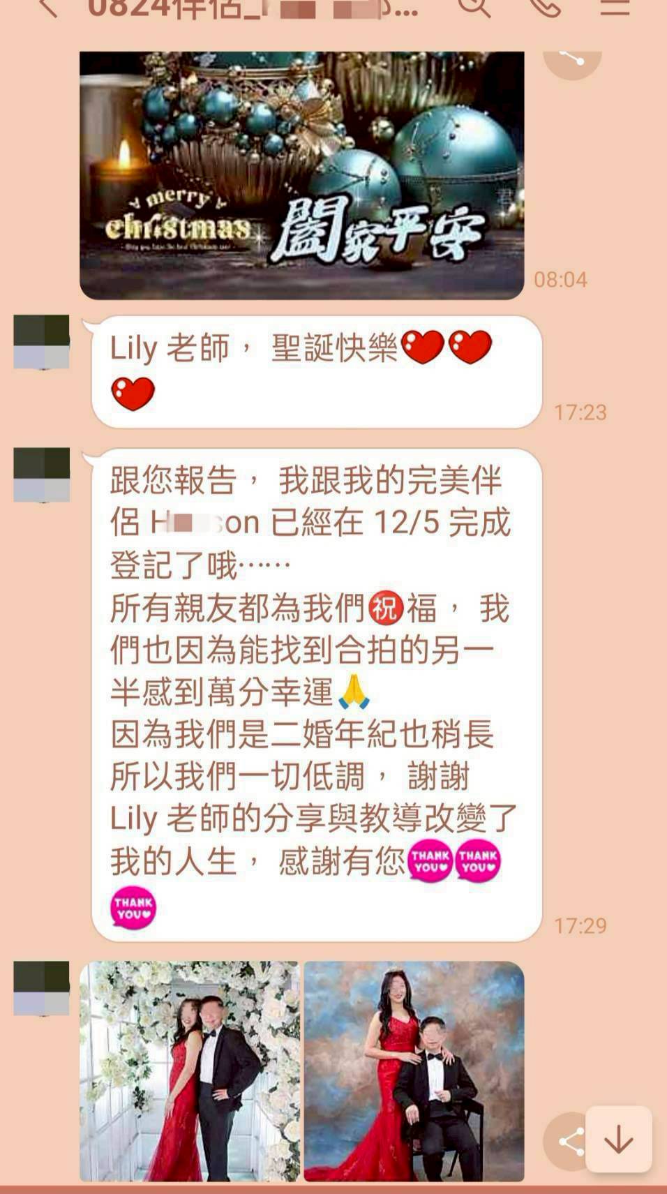 🌹32歳,女,公務員~我一直認為我是個平凡的女孩,但是在Lily老師的指導之下,幫我找出我個人的魅力之處,不論是內在還是外在,展現出我個人的特色。我學會如何聊天溝通與人交心,讓我喜歡的人也喜歡我。現在我更有方向及方法的去談戀愛,追求自己的幸福。真的很謝謝Lily老師。
