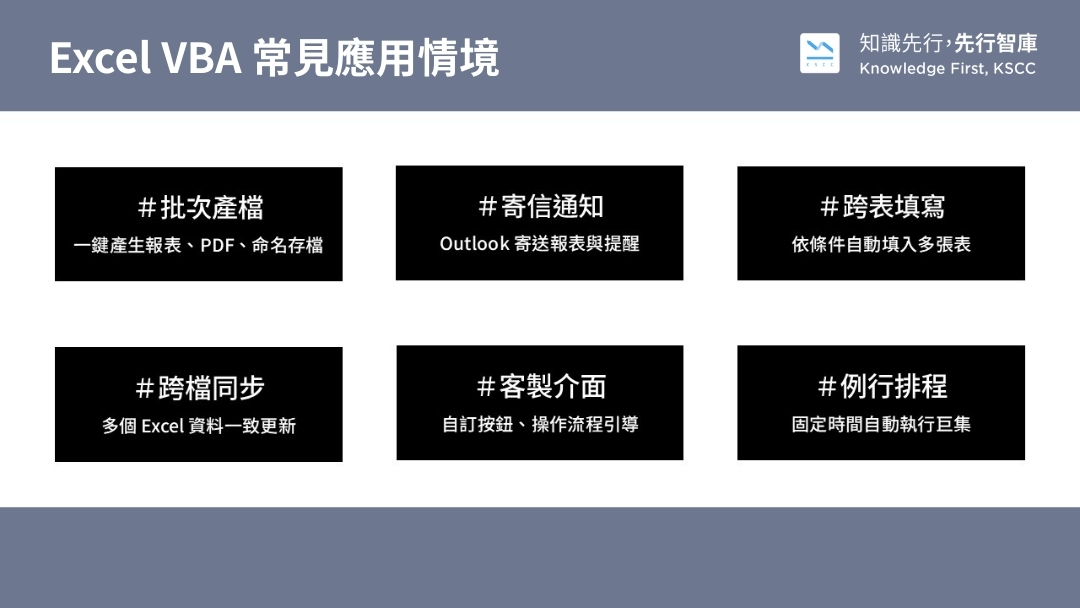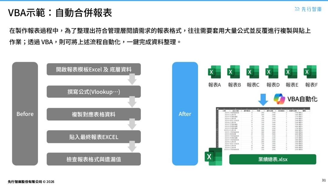 - VBA 與傳統手動處理報表的差異,以及實際工作情境案例說明。