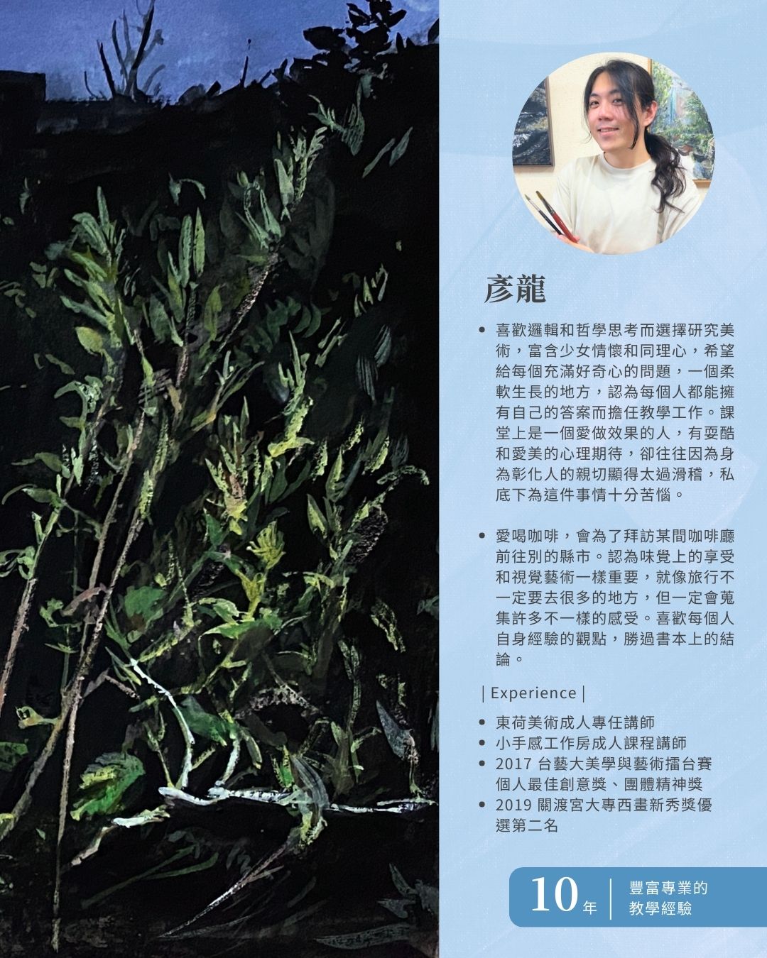 不用擔心沒基礎,幽默又親切的彥龍老師,會用最輕鬆逗趣的方式,帶領大家拆解印象派的色彩祕密。在這裡,畫畫不再是嚴肅的挑戰,而是一場充滿笑聲、像喝咖啡一樣自在的午後時光。