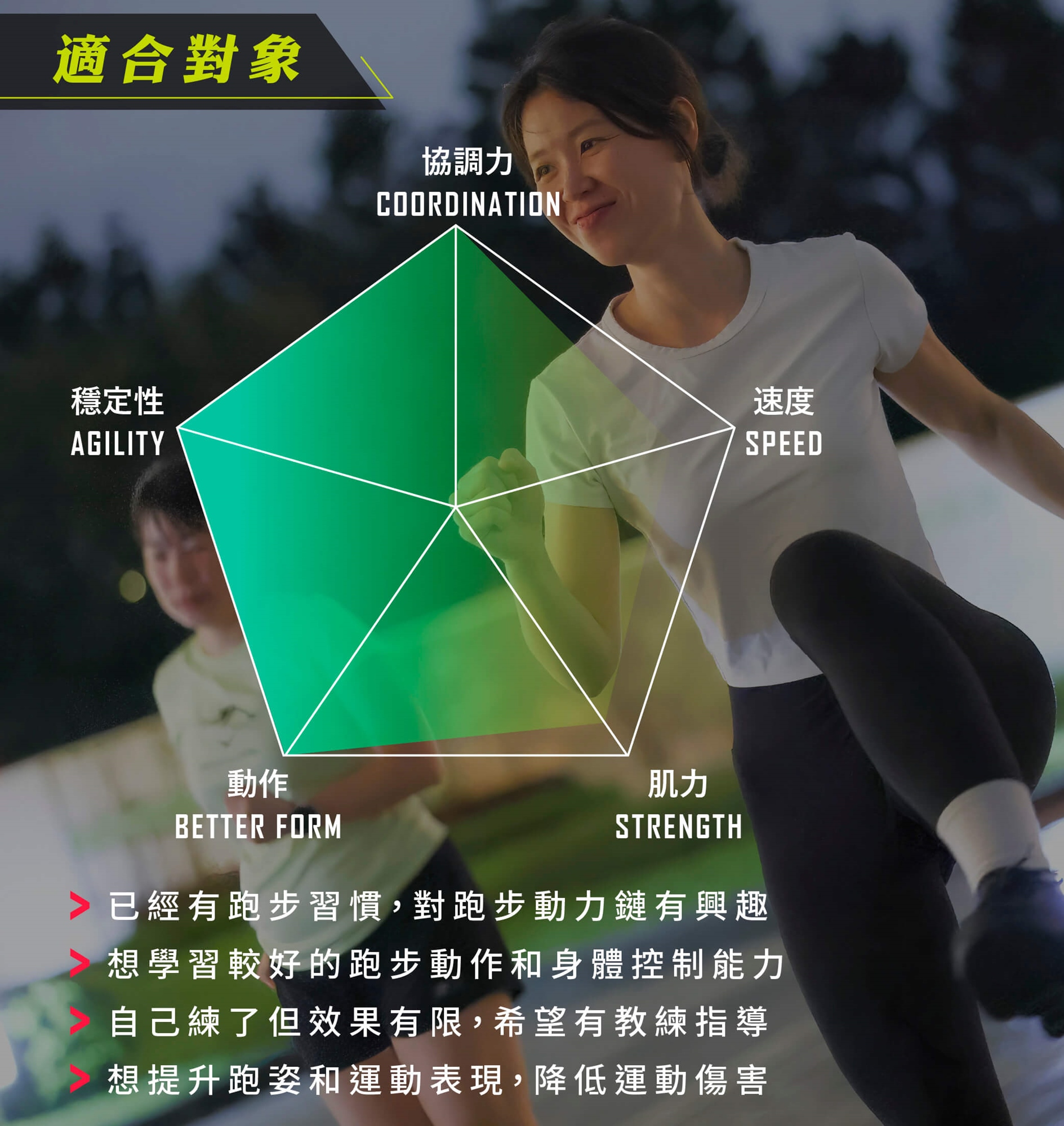 針對跑步所需的⾜部⼩肌⾁群、上下肢動⼒鏈和跑動技術,透過每一堂的技術練習與跑步訓練,學習正確跑感、提升跑步穩定性、讓身體真正懂得如何跑步。