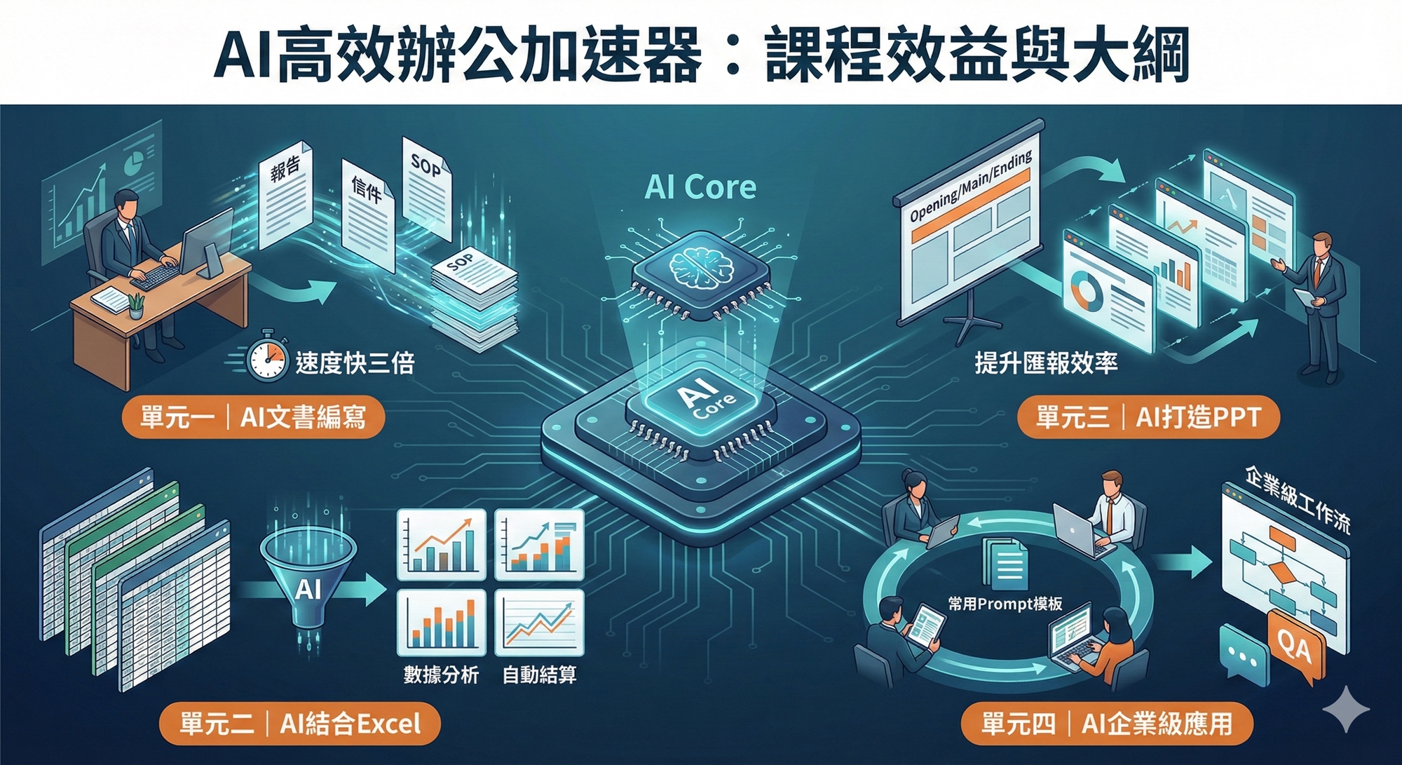 帶領學員系統化了解 AI 在文書產出、數據分析與簡報邏輯上的深度應用。
