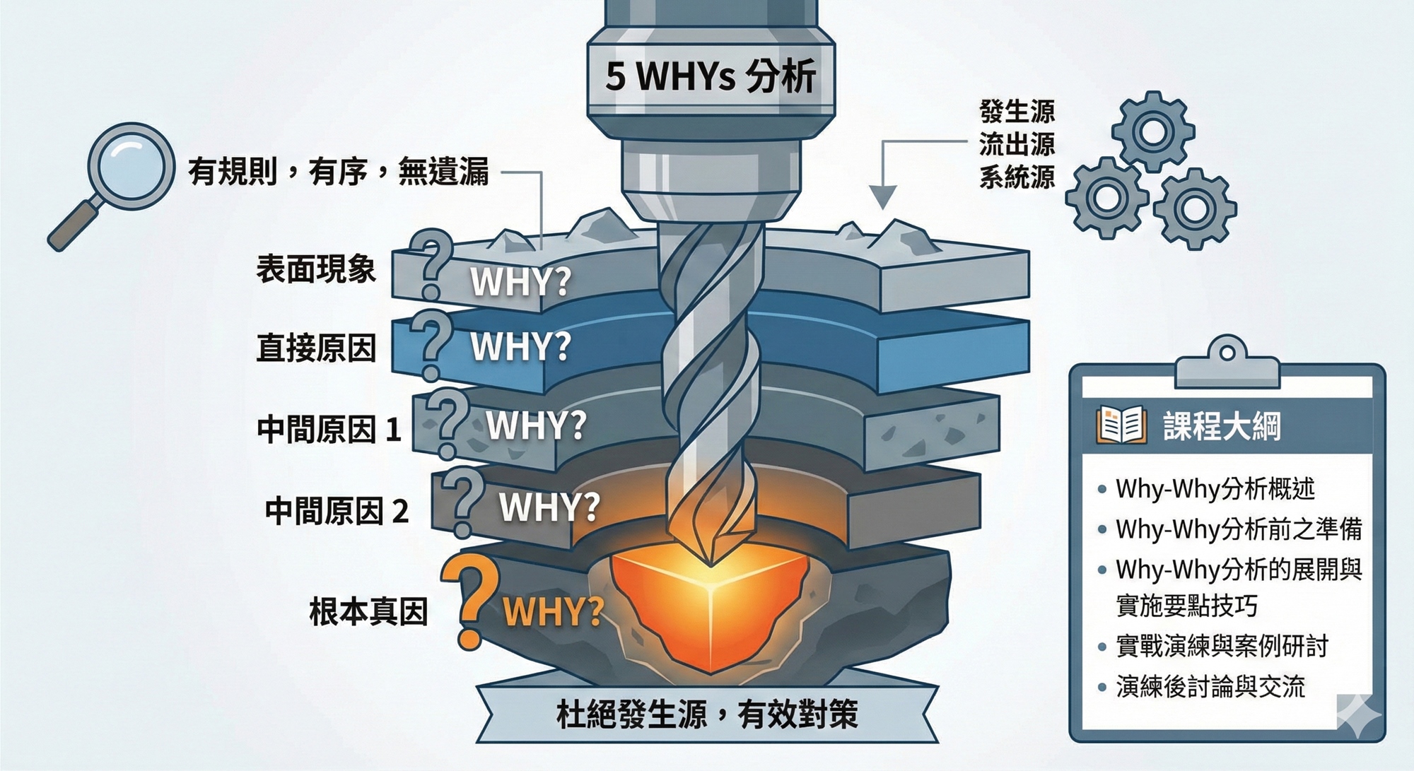 「5Why 分析」看似簡單,實則蘊含深厚的管理邏輯。許多企業在應用時,往往淪為「形式上的問答」,導致找出的原因流於表面。本課程由資深品質專家 王森信老師 執教,旨在引導學員建立一套嚴謹的、有序的要因找尋法。我們將從「加工點分析」出發,帶領學員面對問題不逃避,從混亂的現象中剝繭抽絲,直到觸及系統性的根源。這不只是一門手法課,更是提升製造業核心競爭力的必修課。