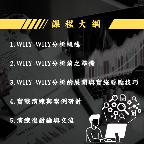 - 建構扎實的根因分析思維:系統化了解 5Why 運作邏輯,理解不良現象與要因間的必然關聯。
