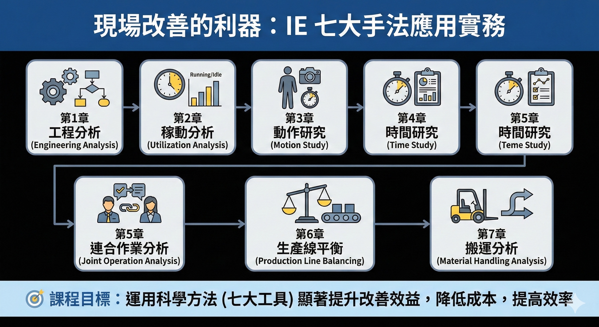 - 全流程改善覆蓋:從微觀的動作研究到宏觀的搬運與連合作業,內容完整紮實。