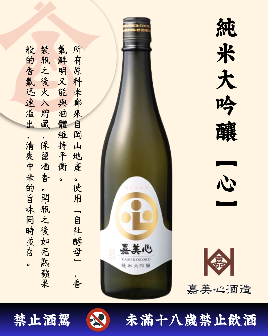 【嘉美心】坐落在日本四國岡山縣,面向瀨戶內海的嘉美心酒造,於1913年,由第一代經營者——藤井長十郎在岡山縣的寄島町創立,在戰後缺米的時代,亦不放棄自創立時起追求「米旨口」的信念。