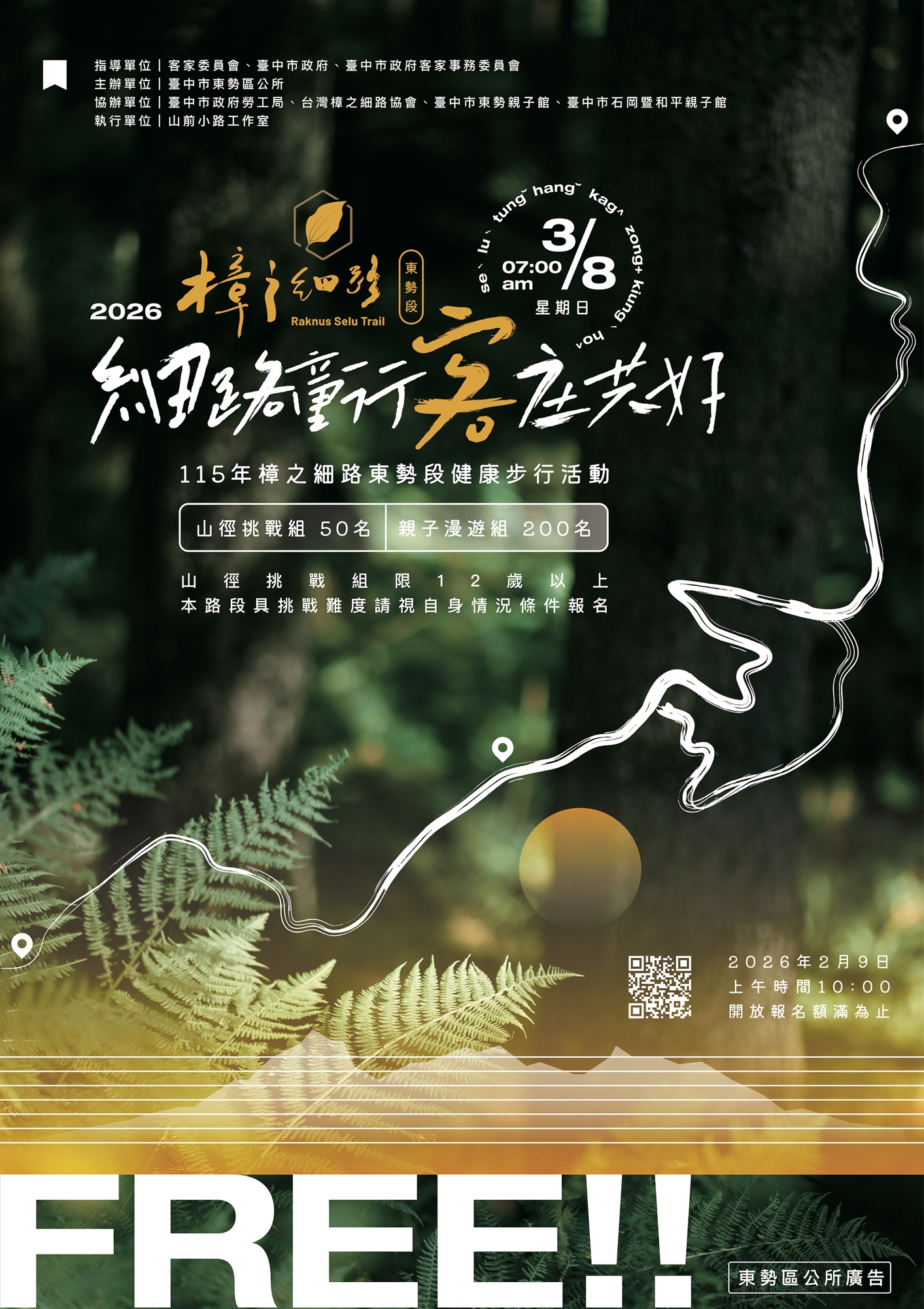 07:00–07:20 | 山徑挑戰組 報到 第一梯親子漫遊組 報到 | 憑報名QRCODE至報到台領取物資包 集合地點:台中市東勢客家文化園區 |