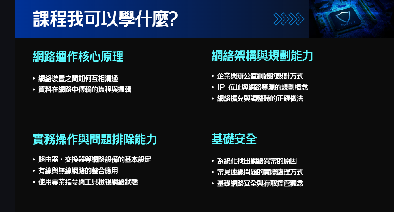 若僅想進修網路工程相關課程,不想跟進產學班,我們也有非產學班的網路系統、資訊安全管理的課程,歡迎登記了解