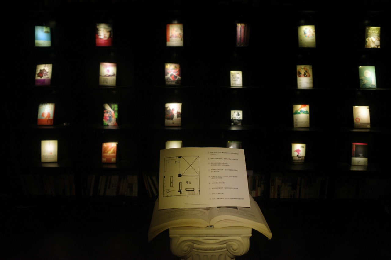- 空間設計: 在做為書店與展覽空間的地下室,營造出一個猶如渡過冥河抵達地獄的純黑地底空間,將微光聚焦於展覽選書,呈現出如逝者化作星辰的意象。