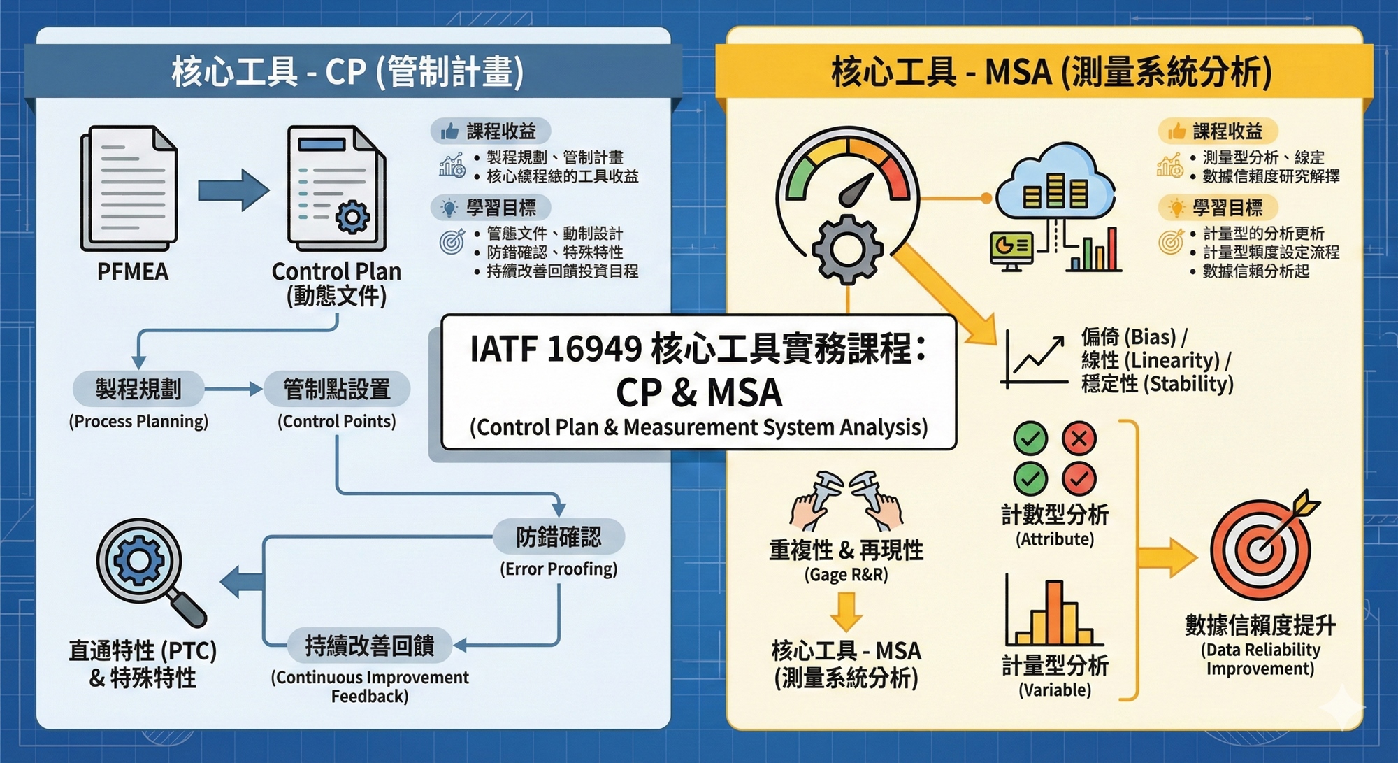 實務演練導向:不僅是教統計公式,更強調如何利用 MSA 分析結果回饋至 FMEA 以提升管制水準。