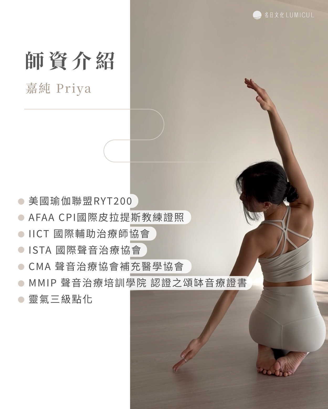 ✦ 美國瑜伽聯盟RYT200 ✦ AFAA CPI國際皮拉提斯教練證照 ✦ IICT 國際輔助治療師協會 ✦ ISTA 國際聲音治療協會 ✦ CMA 聲音治療協會補充醫學協會 ✦ MMIP 聲音治療培訓學院 認證之頌缽音療證書 ✦ 靈氣三級點化 |