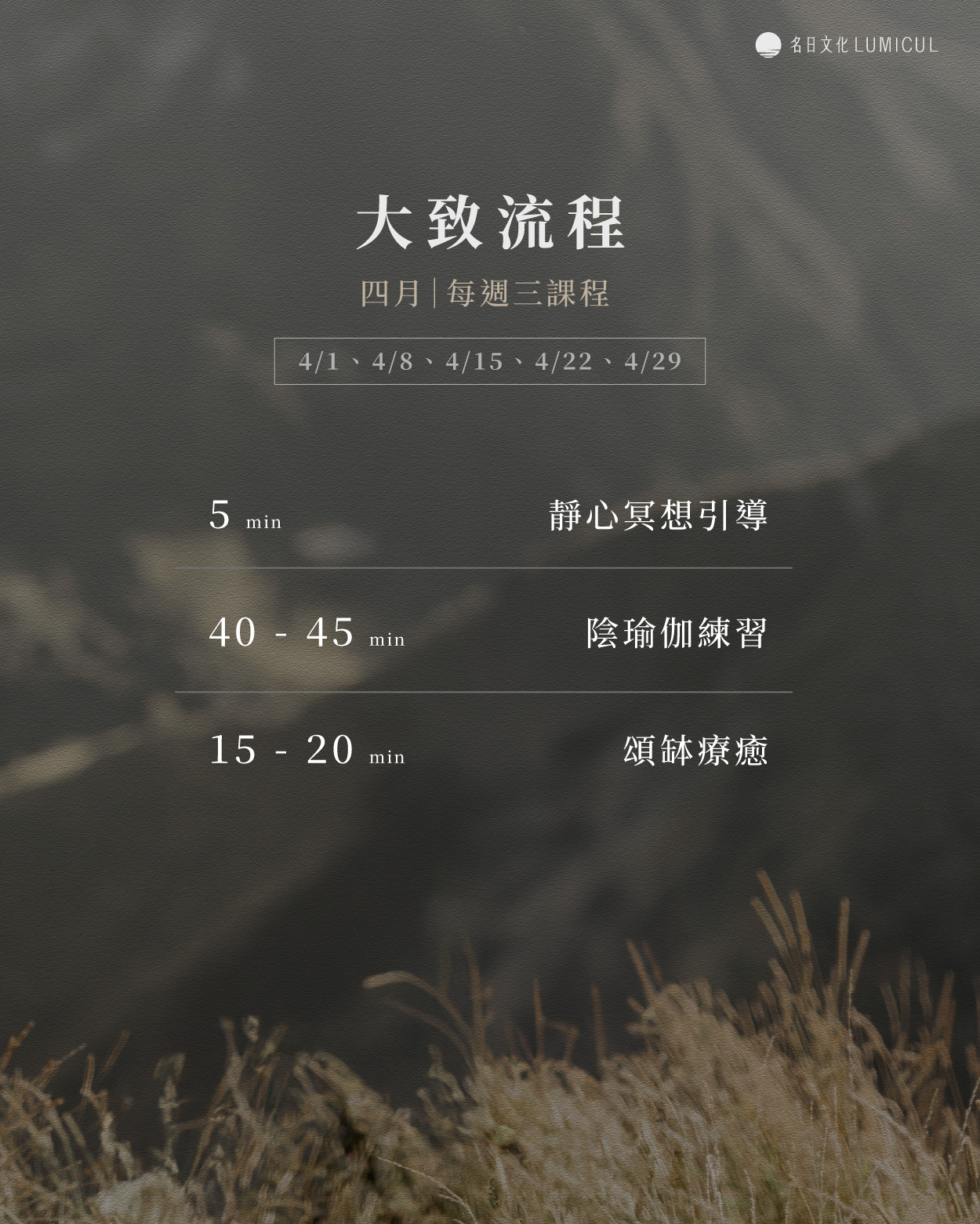 | 日期 | 2026 年 4 月(每週三)晚上 7:30 - 8:30 4/1 、 4/8 、 4/15 、 4/22 、 4/29 |