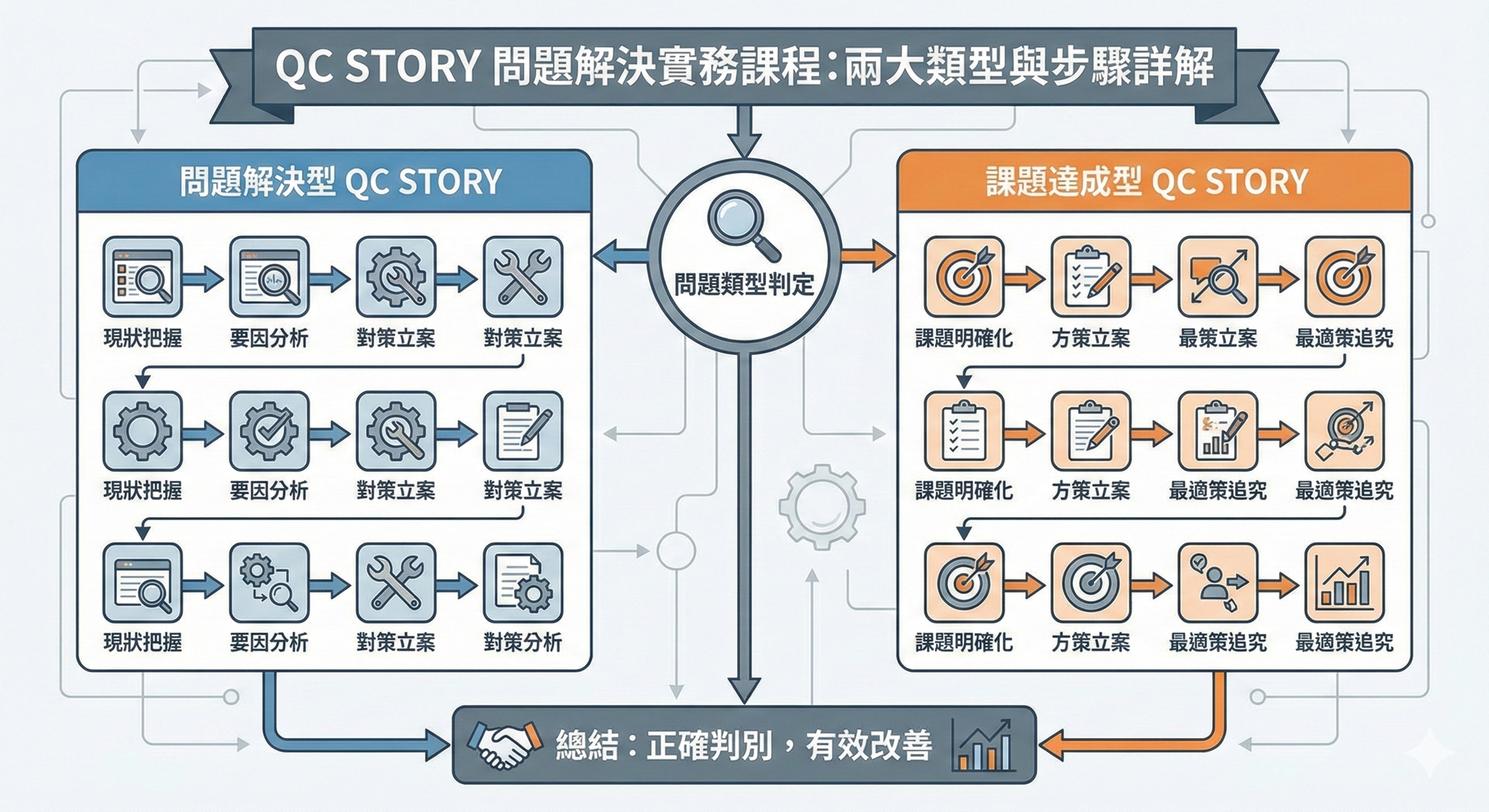- 精通 10 大解題步驟:熟練掌握 QC STORY 兩大類型的標準步驟,確保改善活動具備邏輯性。