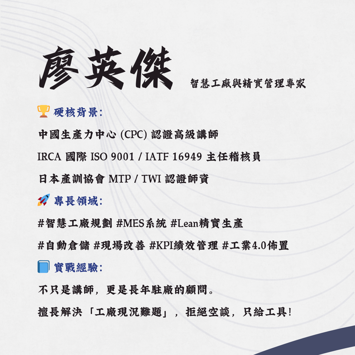 - 硬底子實務傳承:廖老師將深厚的廠長級實戰經驗融入課程,拒絕空談,只教最落地的解法。