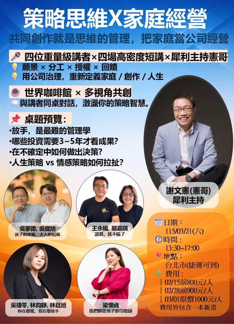 你將與講者 + 他們的伴侶/孩子共桌交流,每一桌主題都聚焦在長期思維、策略設計、決策邏輯,激發你的思辨與共鳴。