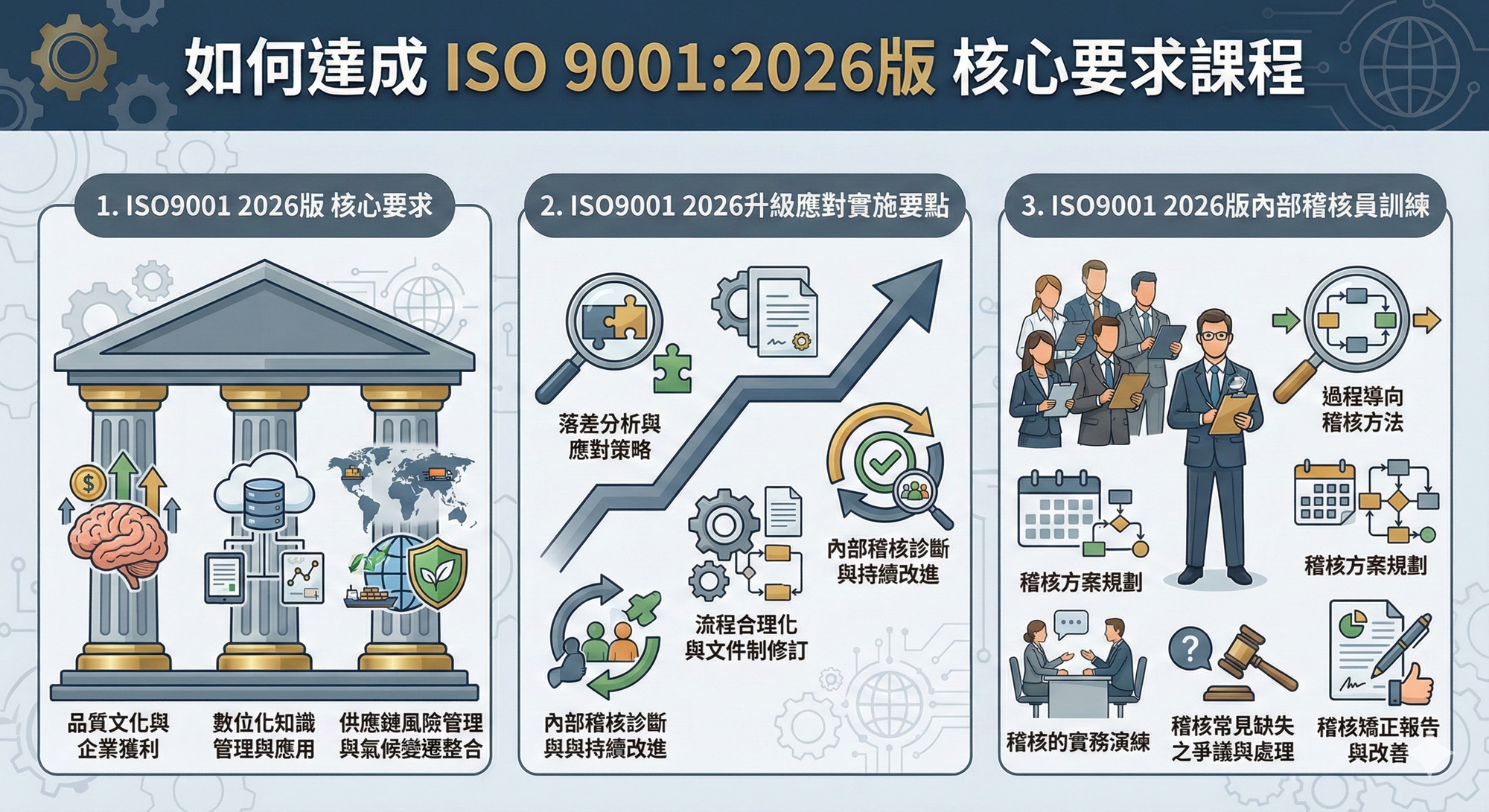 - 構建新版核心認知:精準理解 ISO 9001:2026 關於品質文化、數位 KM 與氣候整合的深層含義。