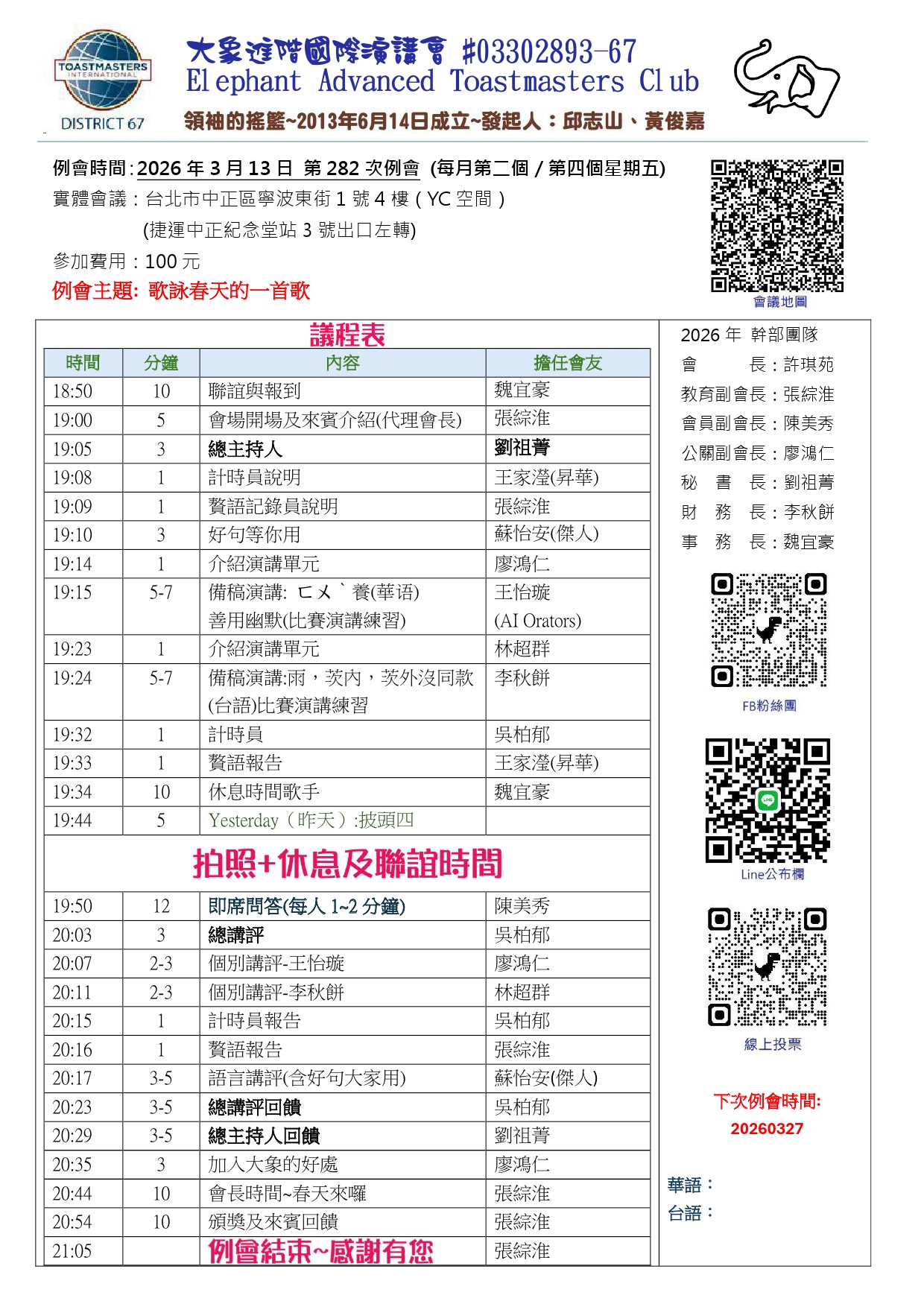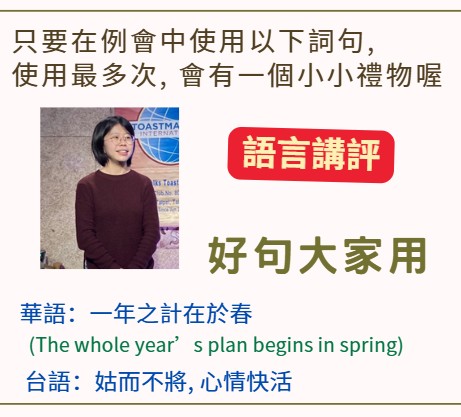 🎉例會由演講會金牌講師劉祖菁擔任總主持人,資深會員吳柏郁擔任總講評,歡迎各位會友,各路來賓,攜家帶眷、呼朋引伴來參加!