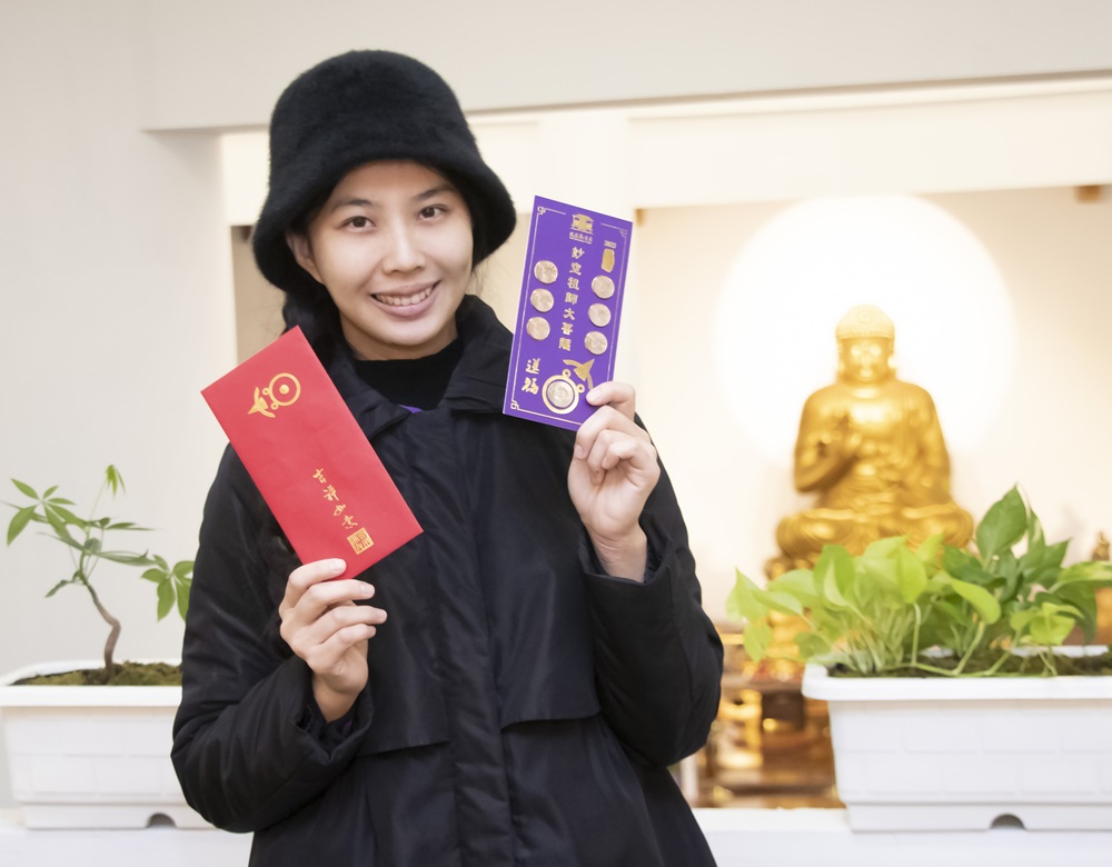 「觀音送福」聖財金以「事事如意‧事事圓滿」紅包袋盛裝的開運錢母