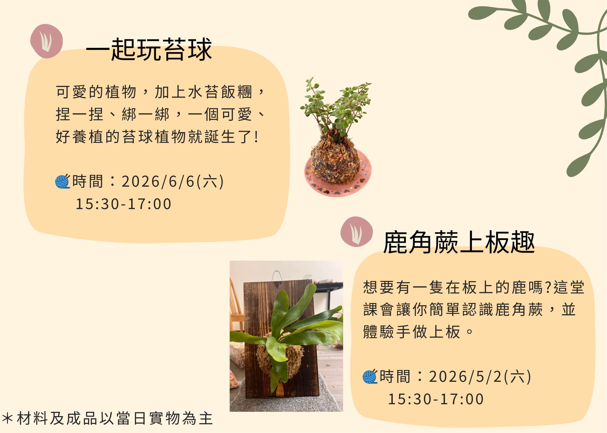 當日成品:上板鹿角蕨1個(鹿角蕨品種依現場狀況提供,不指定)