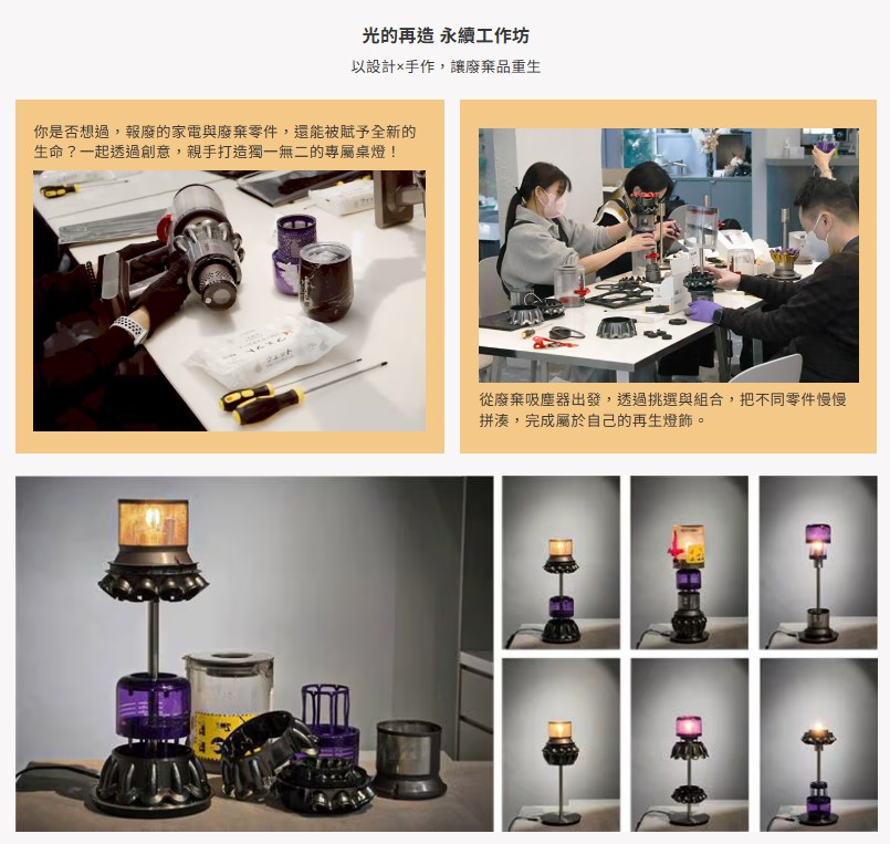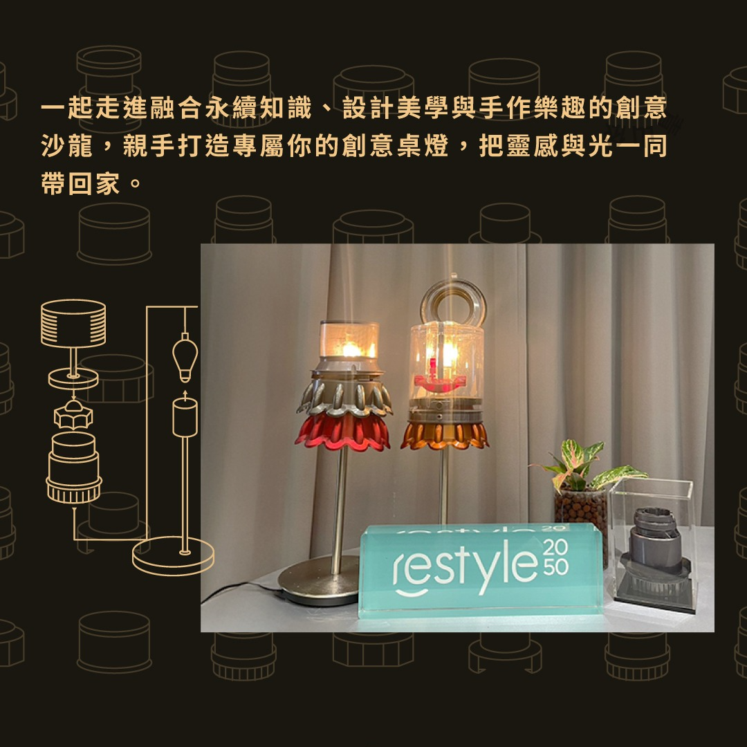 restyle2050 推廣永續利用,舉辦手作工作坊,結合廢棄物再生概念,將已不能使用的吸塵器,透過挑選與組合,把不同零件慢慢拼湊,轉換成為實用燈飾。