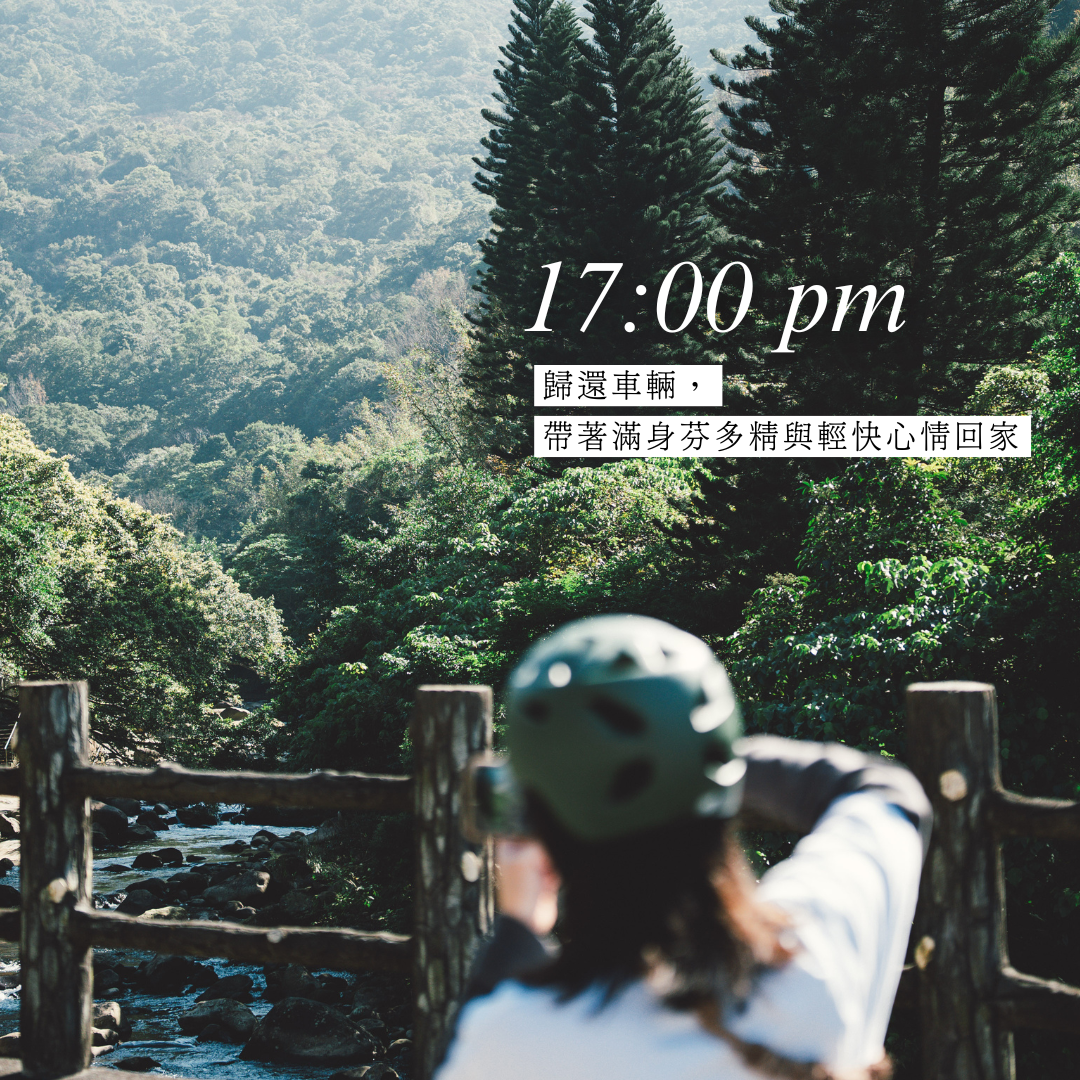 17:00 | 歸還車輛,帶著滿身的芬多精與輕快的心情回家。
