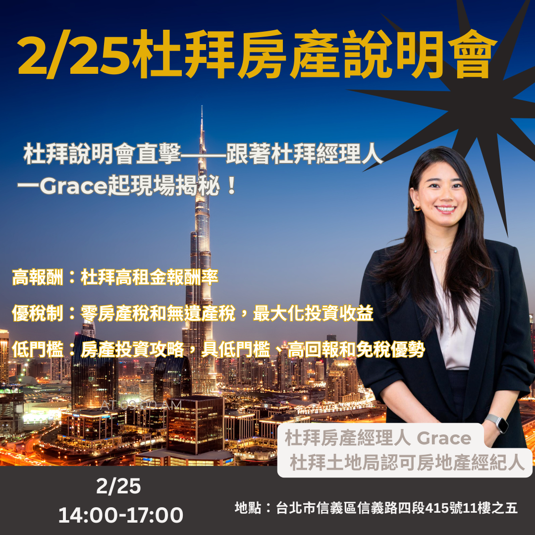 本次說明會特別邀請 杜拜土地局認可房地產經紀人——Grace,從第一線的實戰視角,帶你深入了解杜拜房市的真實樣貌,打破海外置產高不可攀的迷思!