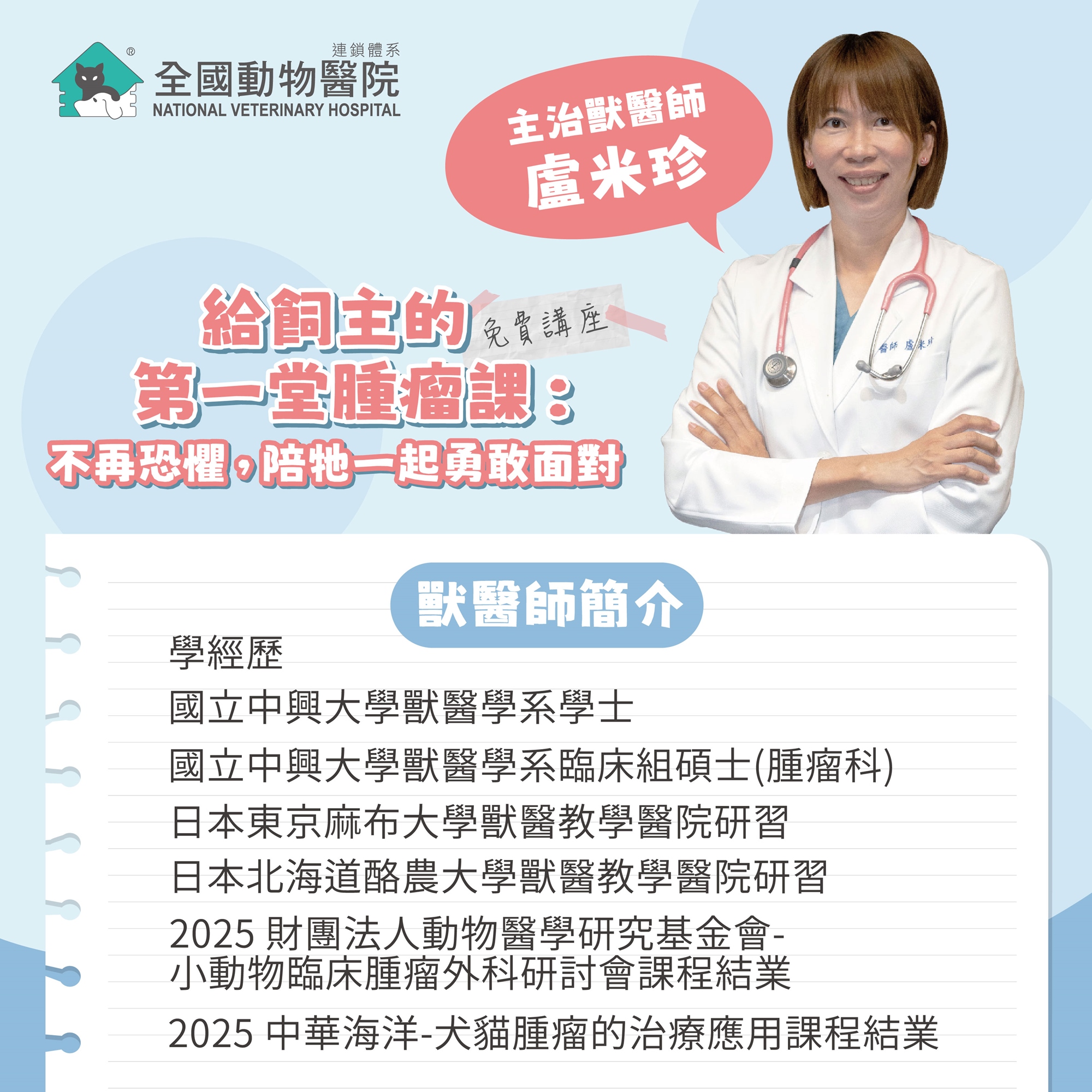 盧米珍 獸醫師|國立中興大學獸醫學系臨床組碩士(腫瘤科)畢業,專長為腫瘤的診斷與外科治療。