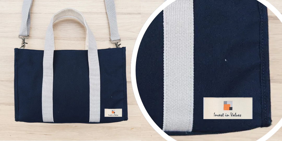 我們在包款設計中注入專屬於管院人靈魂的小巧思。在每一只管院包上,我們同時縫製了兩款精緻織標:側面縫著「元智管院」的中英文標記;正面則是充滿現代感的「壓縮 LOGO 色塊」,將學院色彩凝縮於方寸之間,以及「Invest in Values」文字。