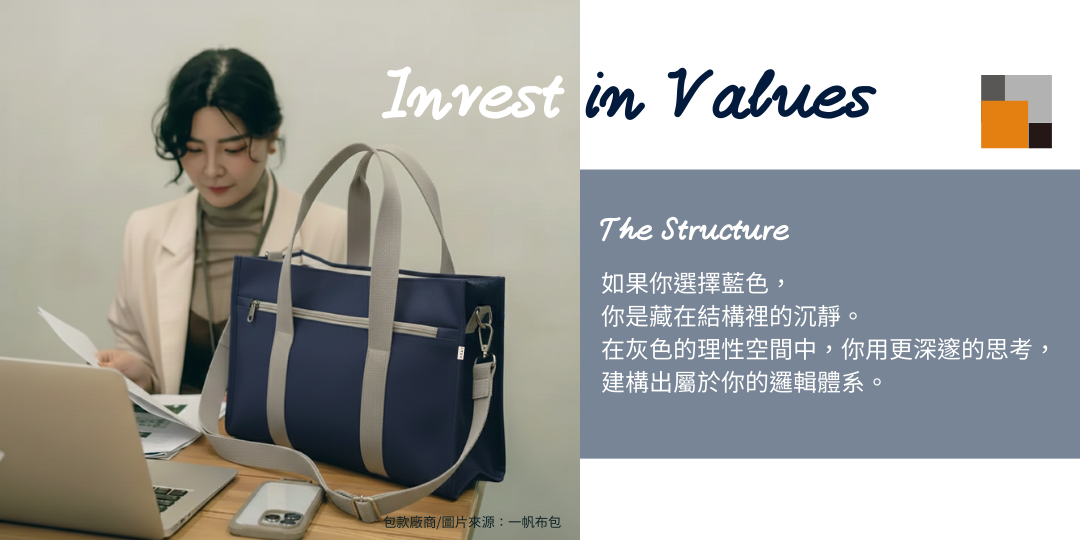 🔵 專業藍 (The Structure) —— 邏輯與內斂的底蘊 如同隱入清水模陰影裡的深邃。袋上藍色,您是藏在結構裡的沉靜,用智慧建構出專屬於您的專業體系。