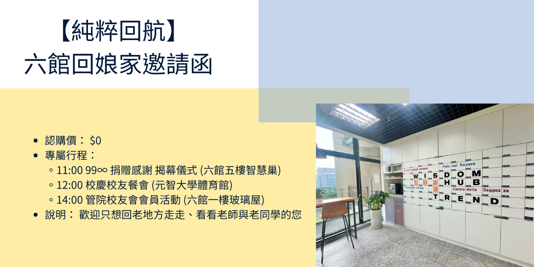 「六館的灰是基調,您的顏色是主角。」 3/14 元智校慶,我們在老地方等您。這是一場屬於管院人的「價值再發現」。您可以選擇免費領取邀請函回娘家走走,也可以認購限量的校慶周邊——「管院包」,將這份傳承與專業實體化,袋著價值走向更遠的地方。