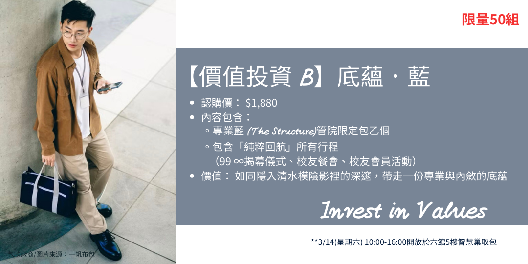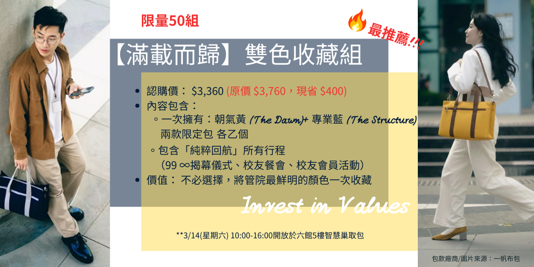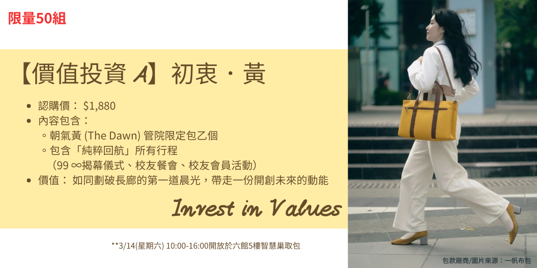 如果您想「袋」走這份價值: 請選擇 [價值投資方案]。讓「朝氣黃」或「專業藍」成為您職場上的色彩,實體化那份專屬於管院人的韌性與專業。