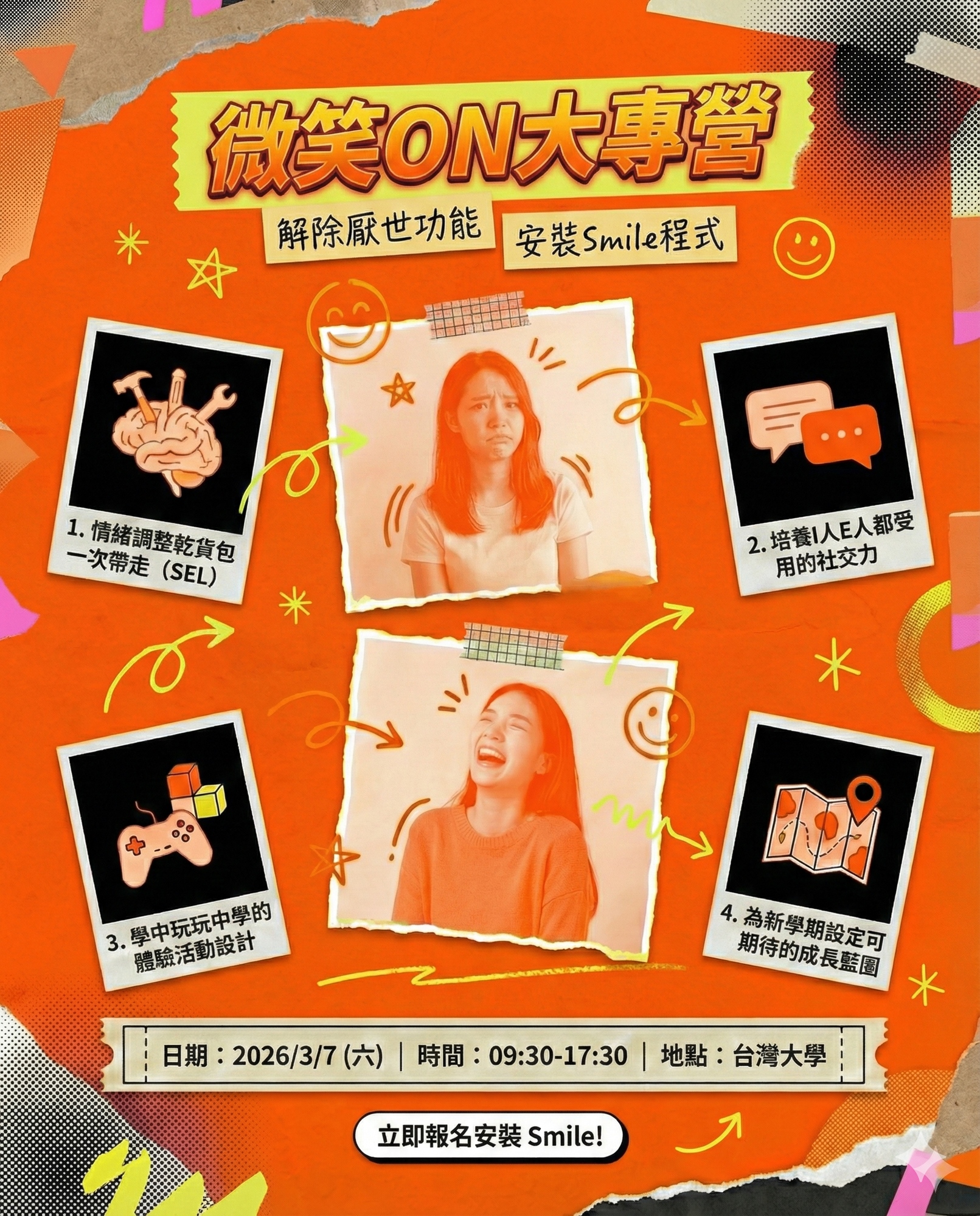 1. 情緒調整乾貨包 : 發掘自我與周遭的關鍵要素,透過經驗分享與體驗,為自己注入新的能量 !