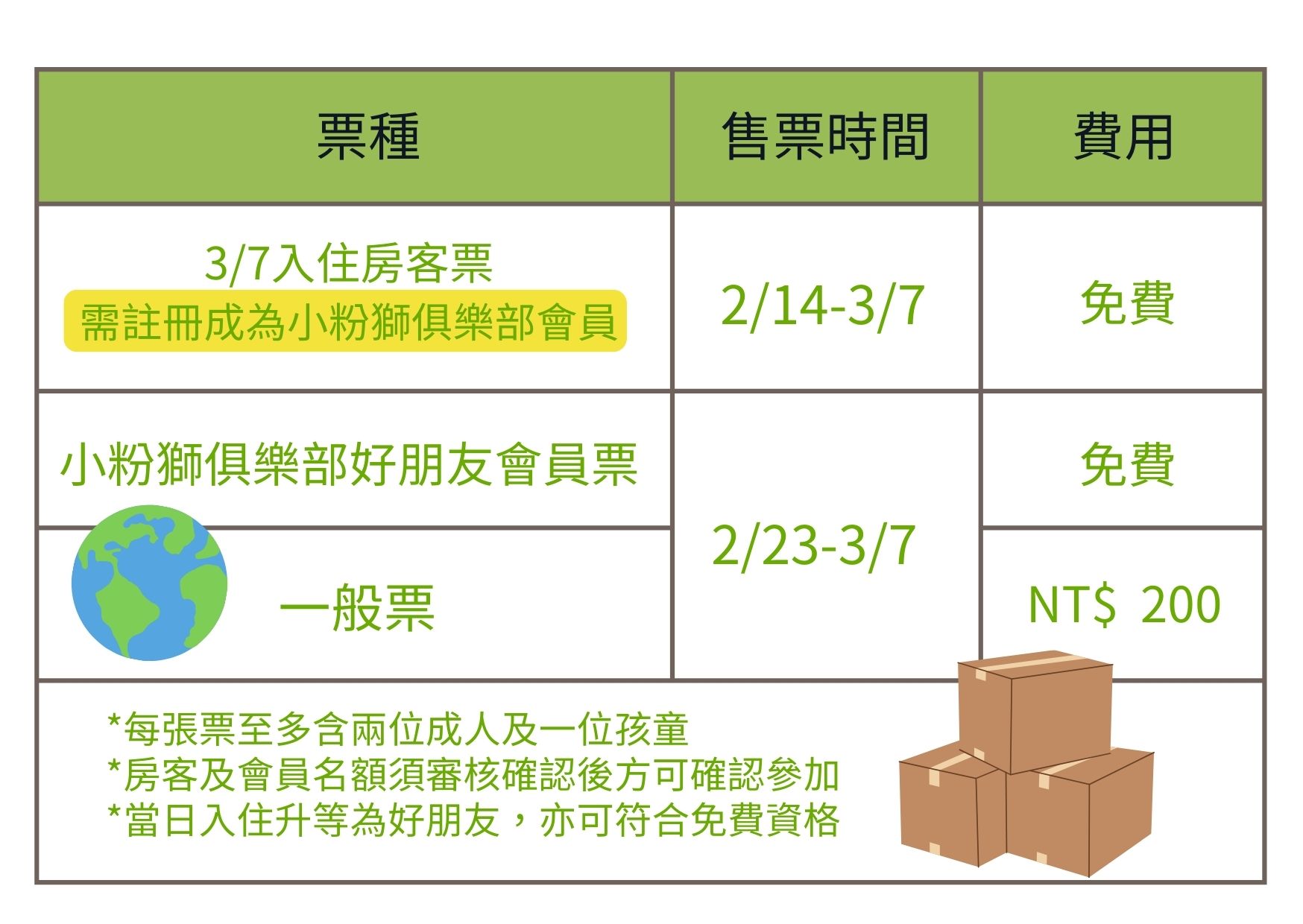 1.每房最多兩組免費名額,如超過需另行購買一般票