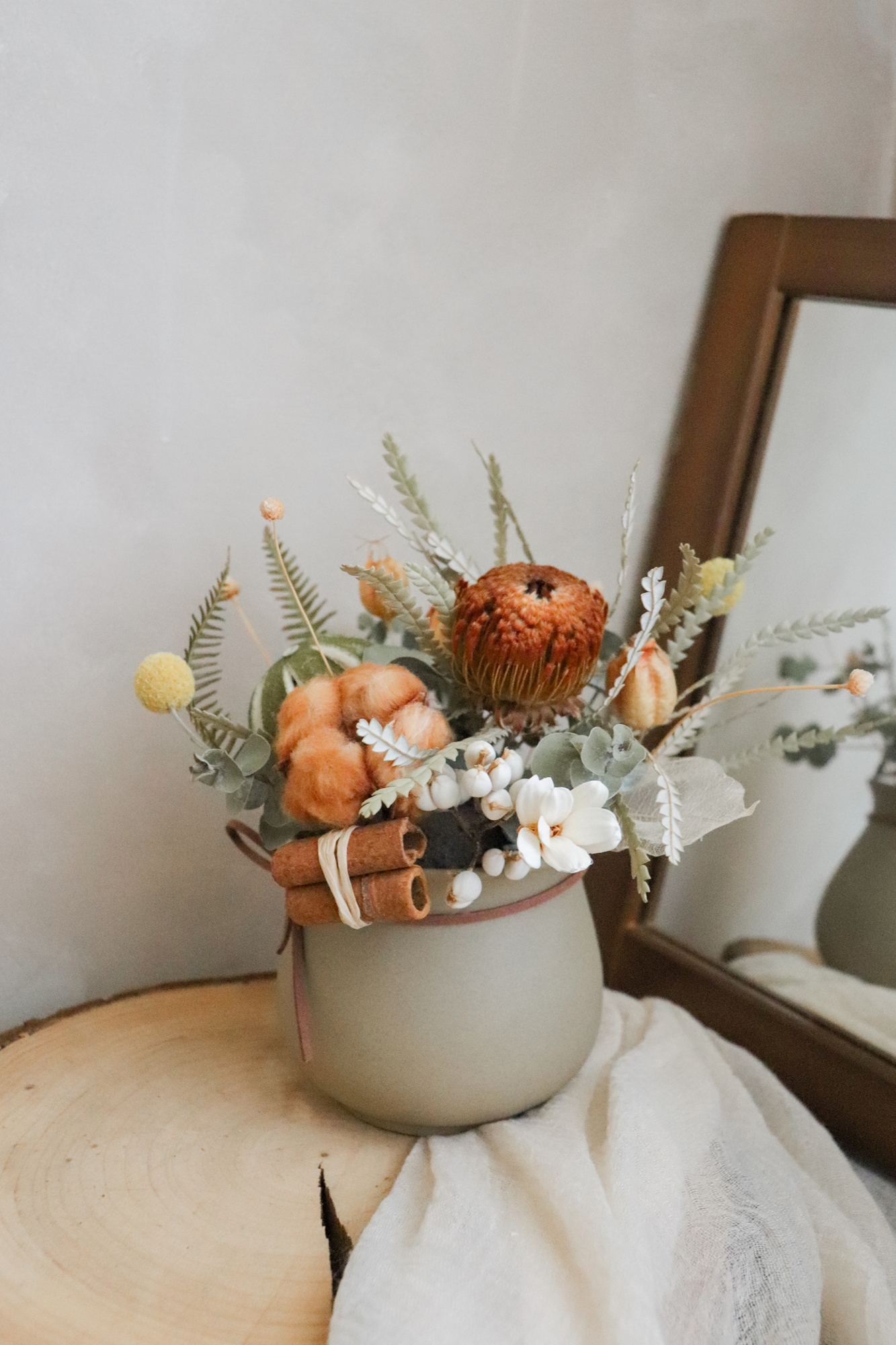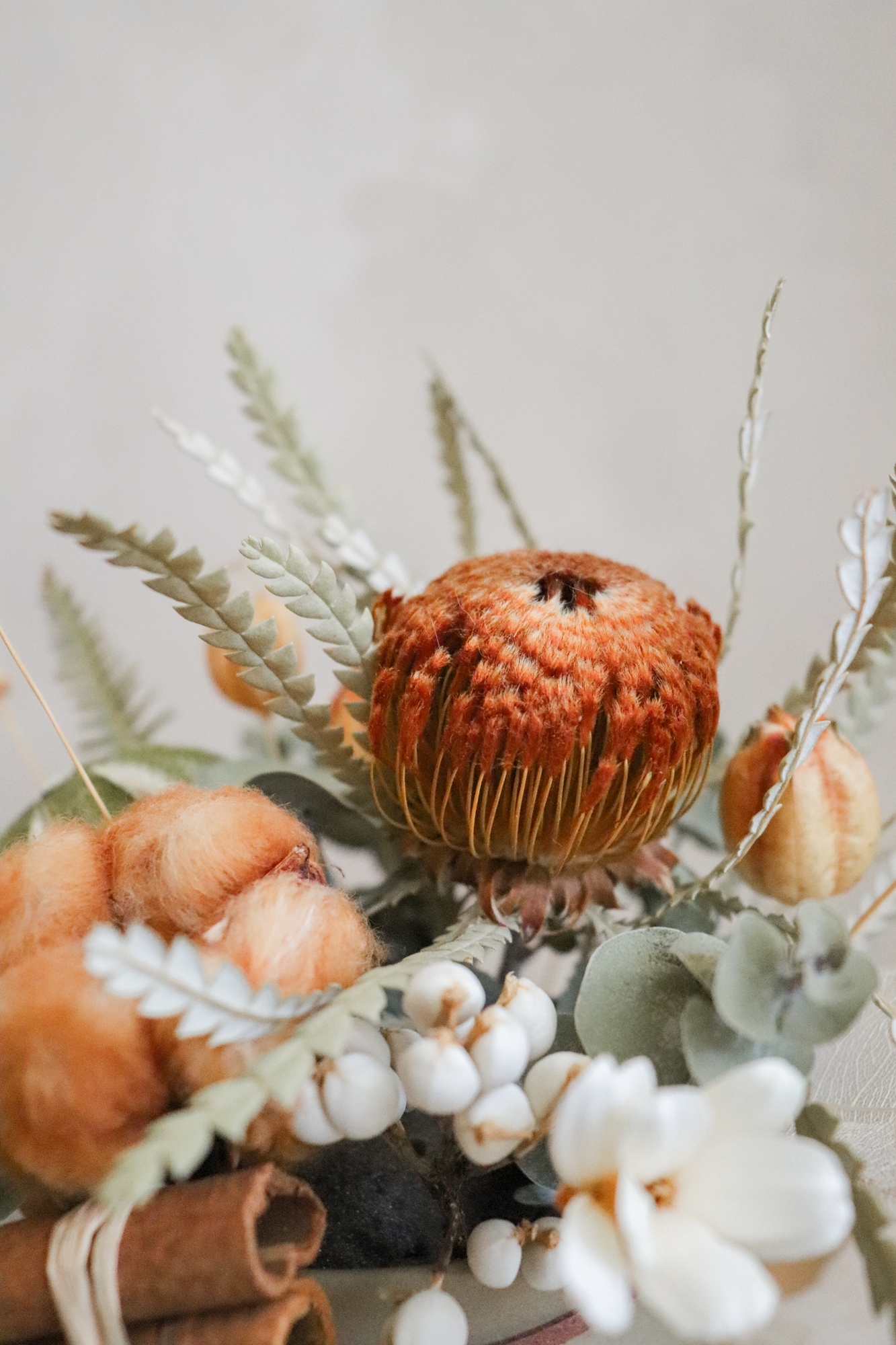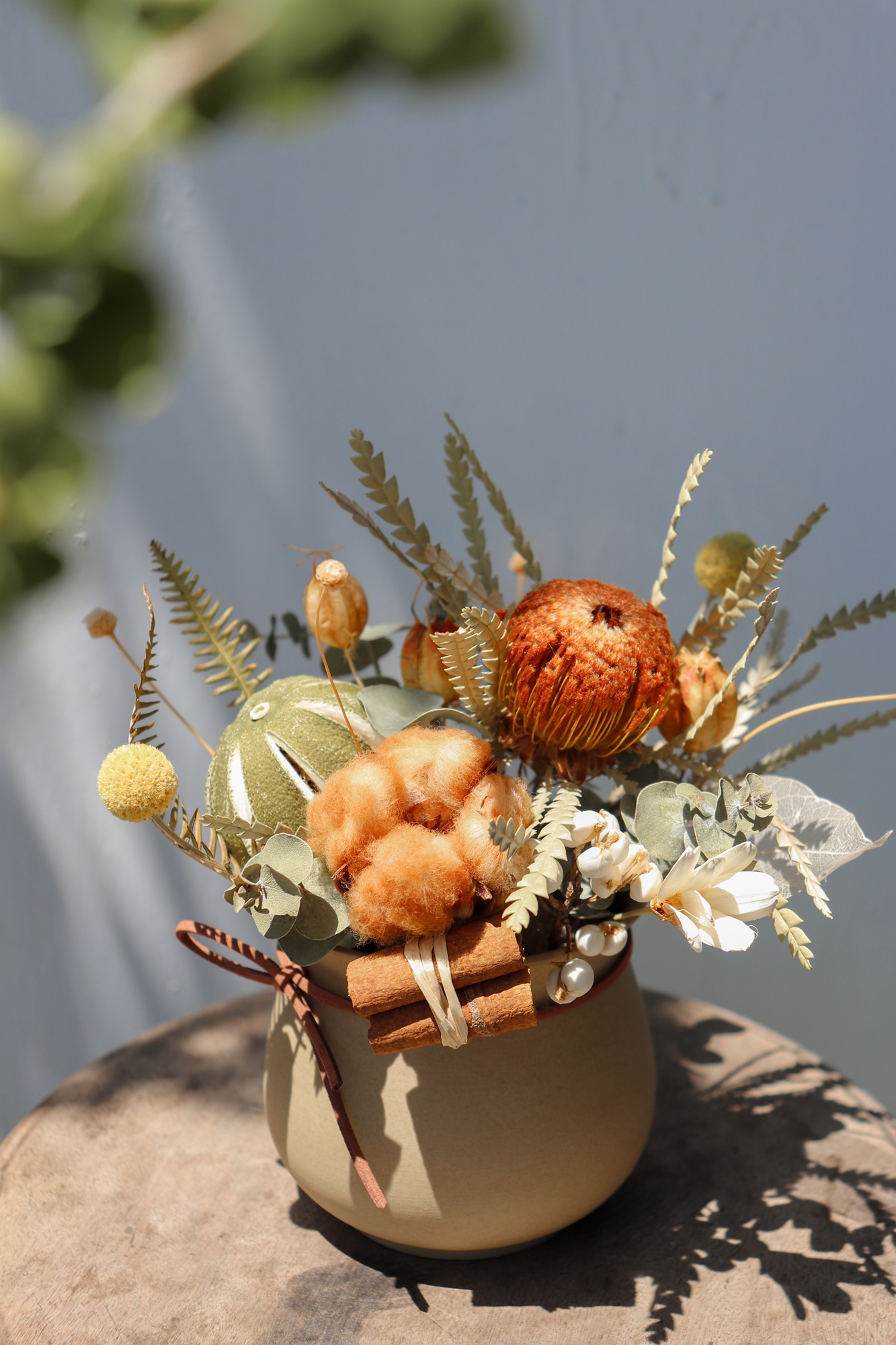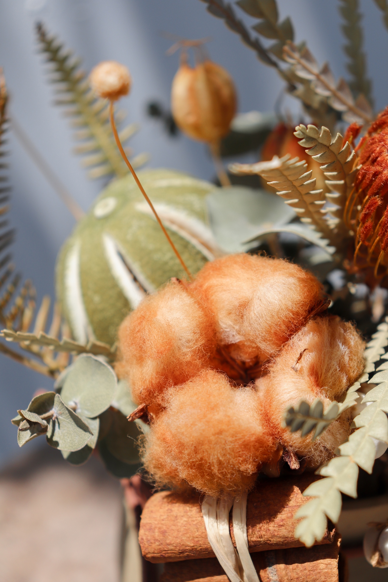 選用沙茂尖、棉花、肉桂、 與各式乾燥果實,