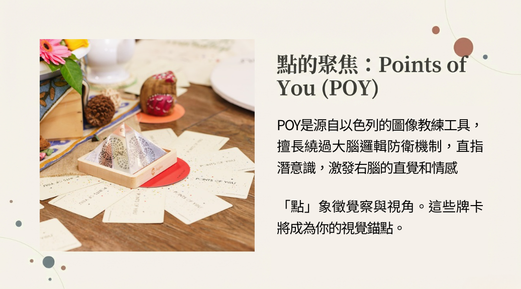 「點」象徵著覺察與視角。我們將運用POY牌卡進行視角轉換的練習。每一張牌卡都沒有標準答案,卻能如鏡子般映照出你此刻的內在狀態。你將練習看見盲點、重構意義,為卡住的問題找到新的出口。