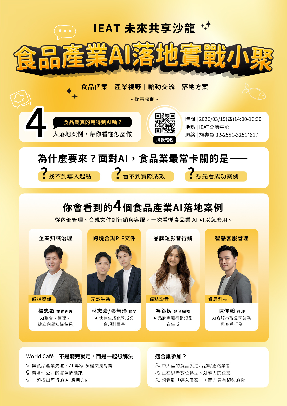 本次小聚聚焦AI知識管理、PIF合規、行銷內容生成、AI客服等食品業關鍵應用,