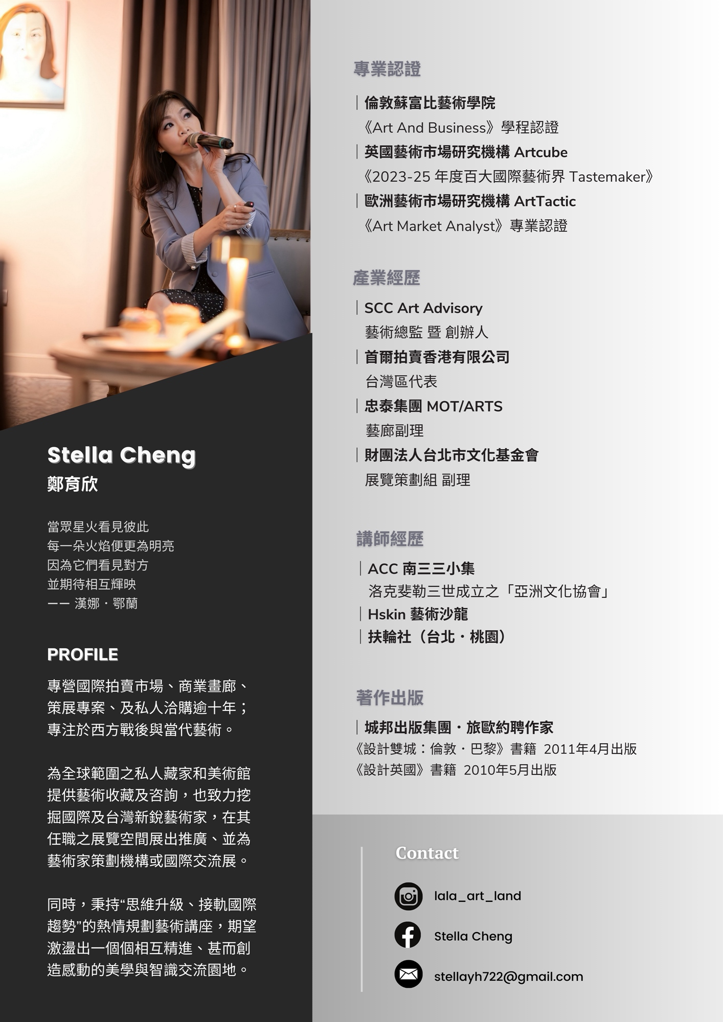 Stella 跨足英國文學教育背景,深耕第一線國際當代藝術市場、策展與顧問專業。在出版過藝術書籍著作,橫跨藝廊與國際拍賣公司實務經驗之餘,秉持”思維升級、接軌國際趨勢”的熱情規劃藝術講座,擅長以真實的生命經驗與哲思的敘事邏輯,拆解藝術的抽象論述。