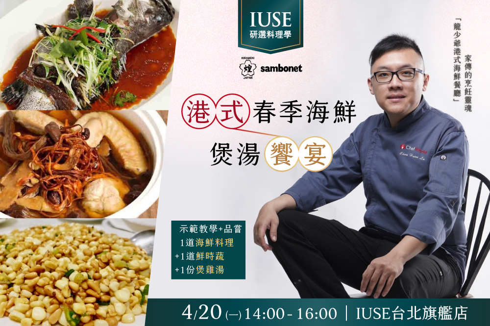 IUSE 特別邀請「龍少爺港式海鮮餐廳」負責人兼主廚 呂俊賢(阿賢老師),分享承襲家傳之味的正宗粵菜傳統名菜,包含肉質細嫩海斑魚搭梅菜清蒸入味的「家鄉梅菜蒸海斑」;以清甜爽脆蔬果拌炒松子的清爽「松子炒水果玉米」;慢火煲雞融合蟲草花淡雅香的清甜醇厚「蟲草花芡實煲雞湯」,邀你盡攬底蘊深厚的山珍海味。