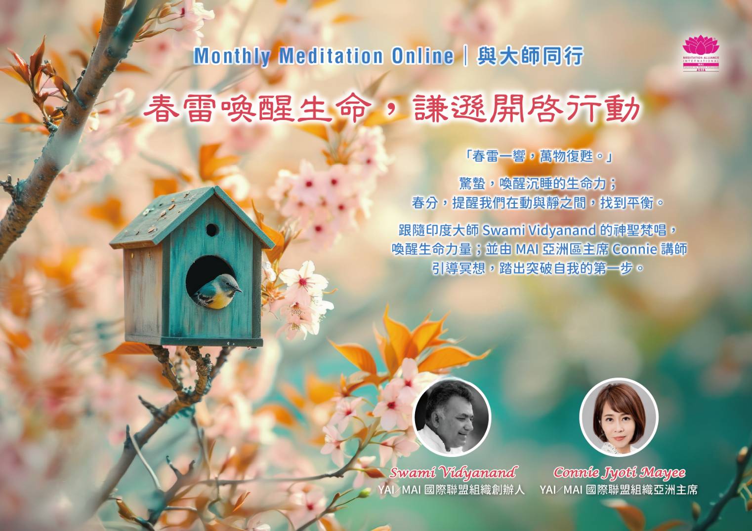 *請您務必將ZOOM會議室的麥克風「關閉」,並將視訊鏡頭「打開」,以便 Swami Vidyanand 大師和Connie 主席與您接頻。