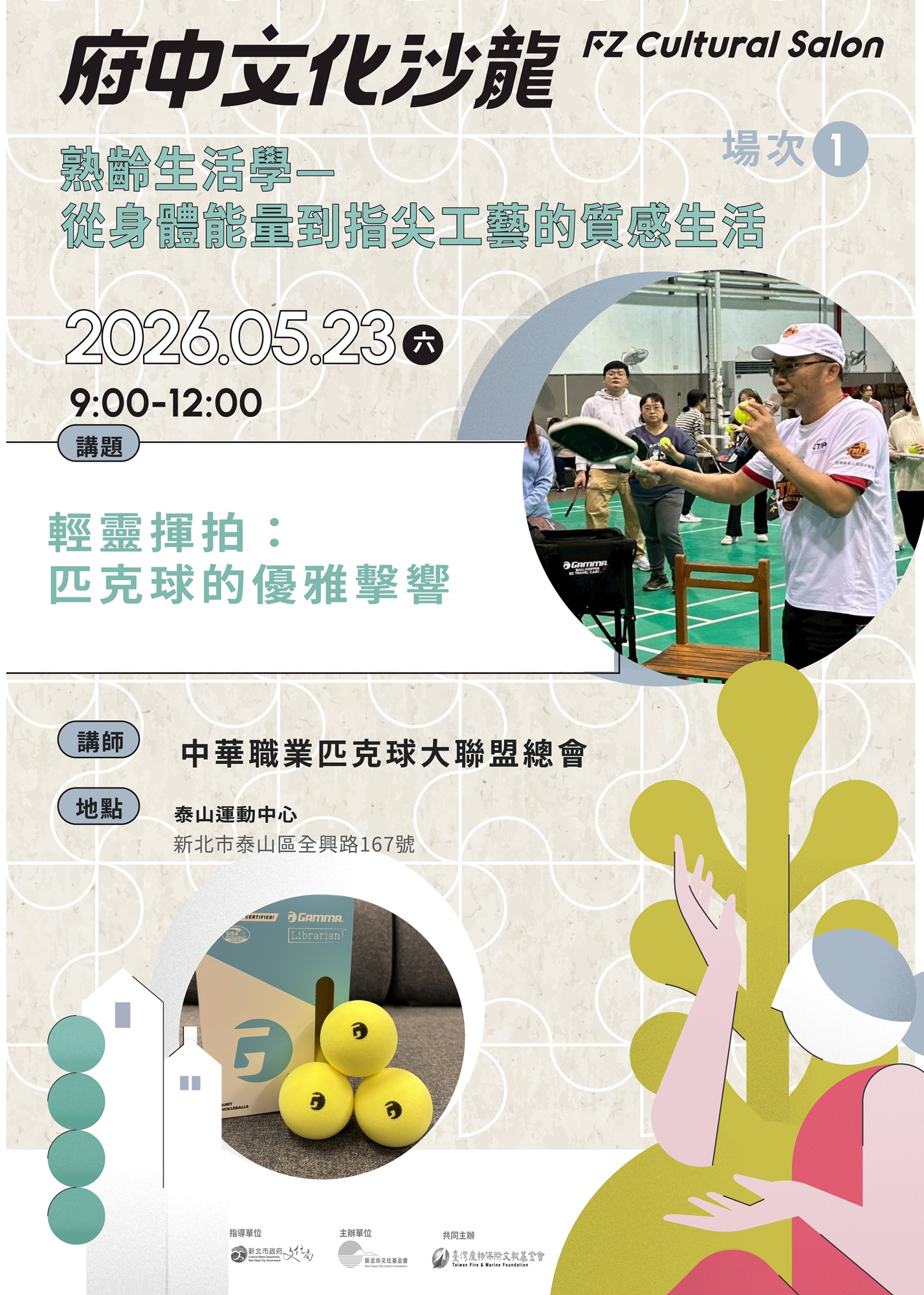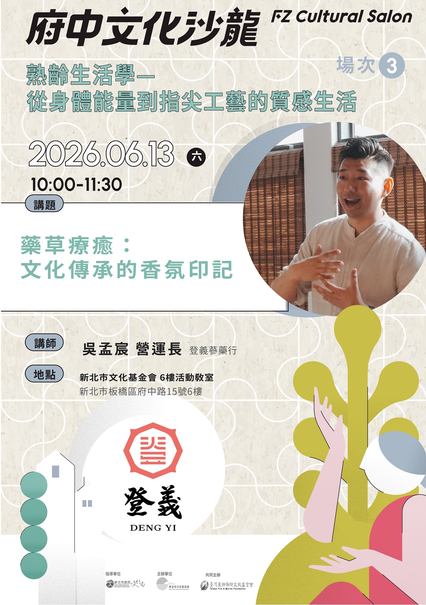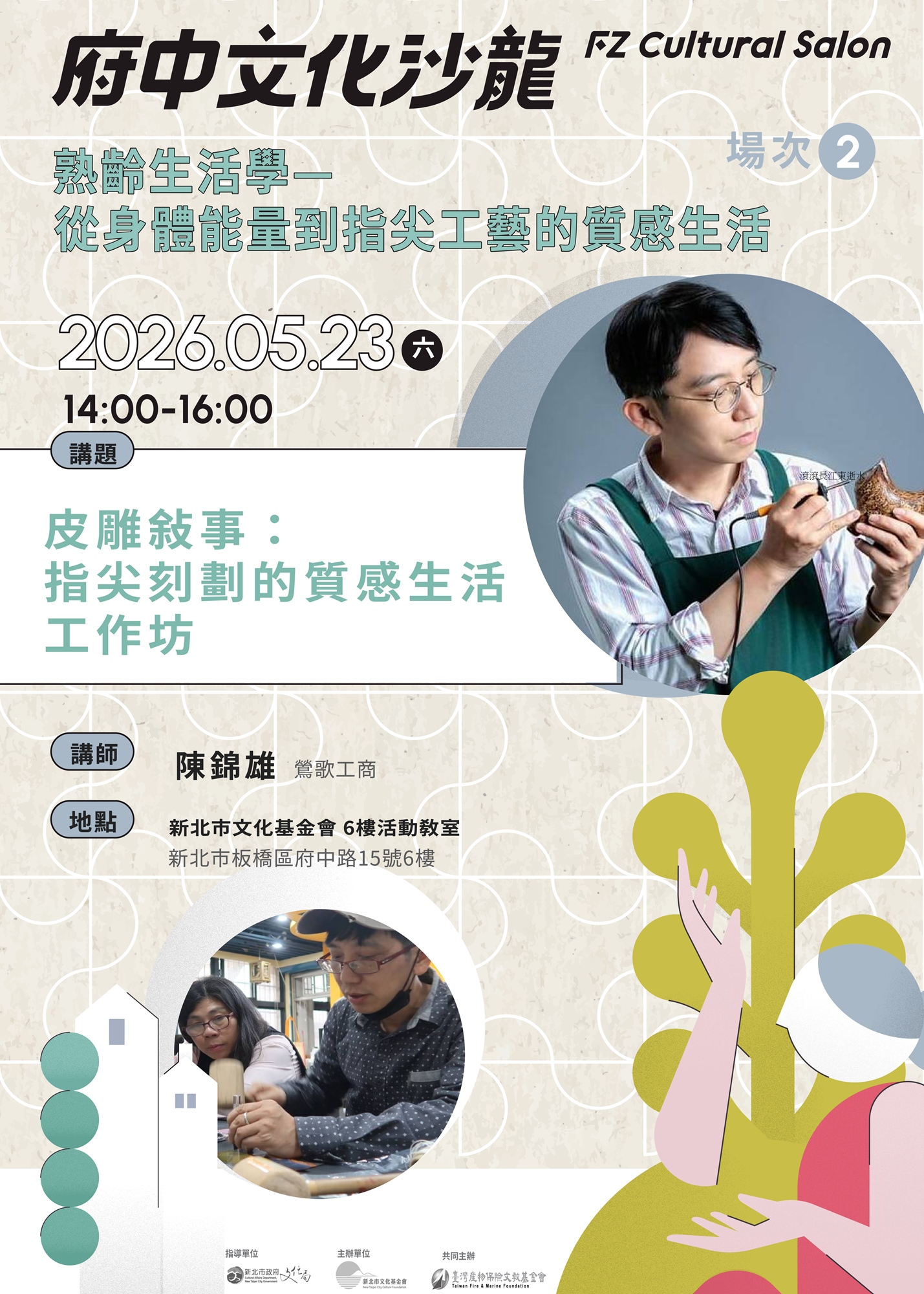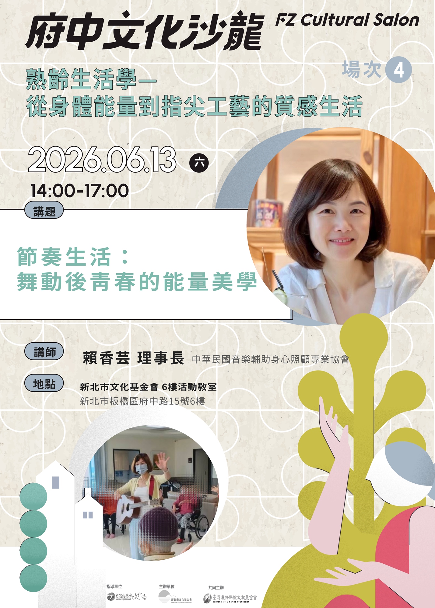 財團法人新北市文化基金會深信,文化與藝術不只是被觀看的成果,而是能實際走入日常、滋養身心的生活能量。2026年「府中文化沙龍」以「熟齡生活學—從身體能量到指尖工藝的質感生活」為主題,將視角回歸「人」與「生活」的深度連結,回應熟齡族群對身心平衡與生活美感的渴望。