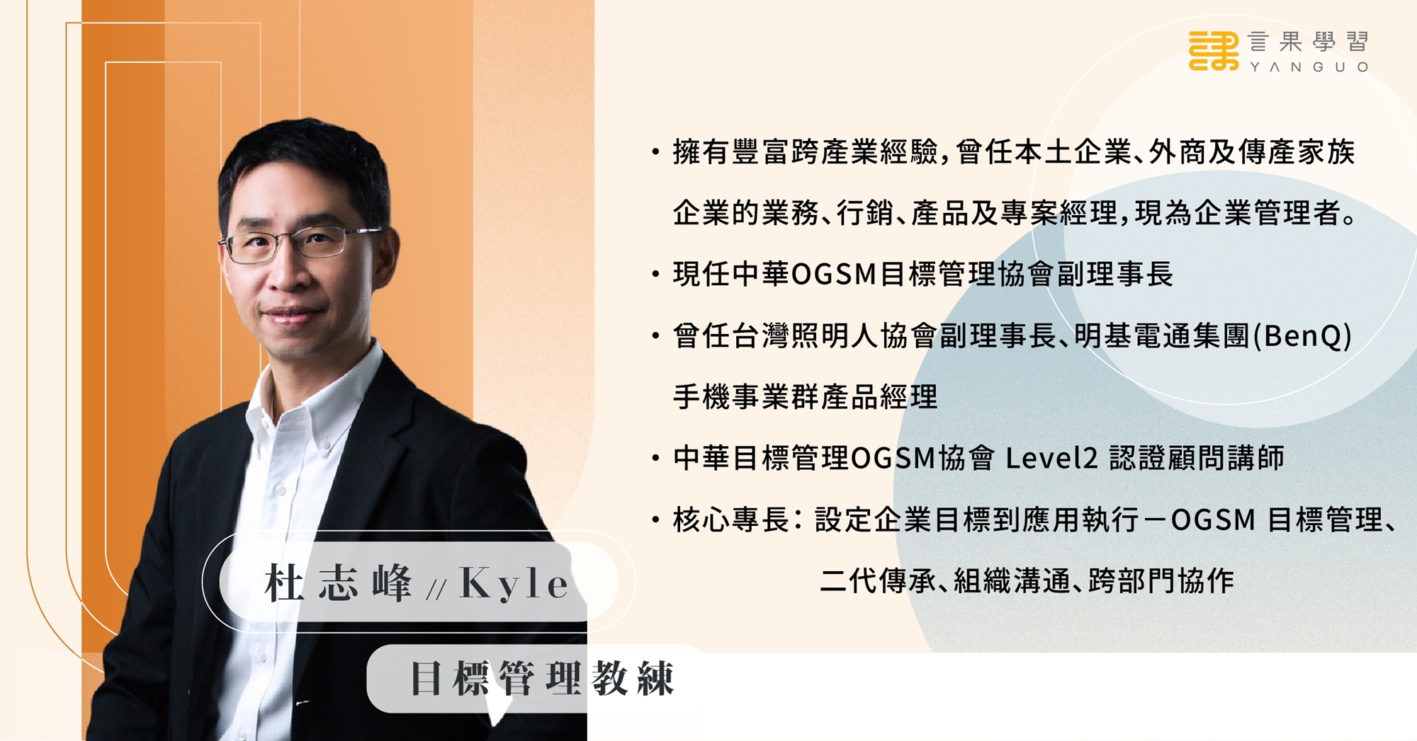 - 核心專長:設定企業目標到應用執行-OGSM 目標管理、二代傳承、組織溝通、跨部門協作