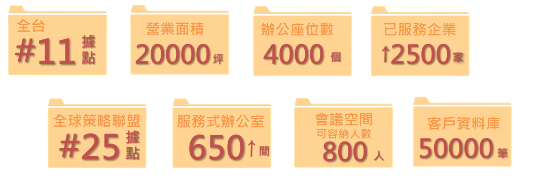 包含辦公室、公司地址登記、共同工作空間、會議室及會議場地等。