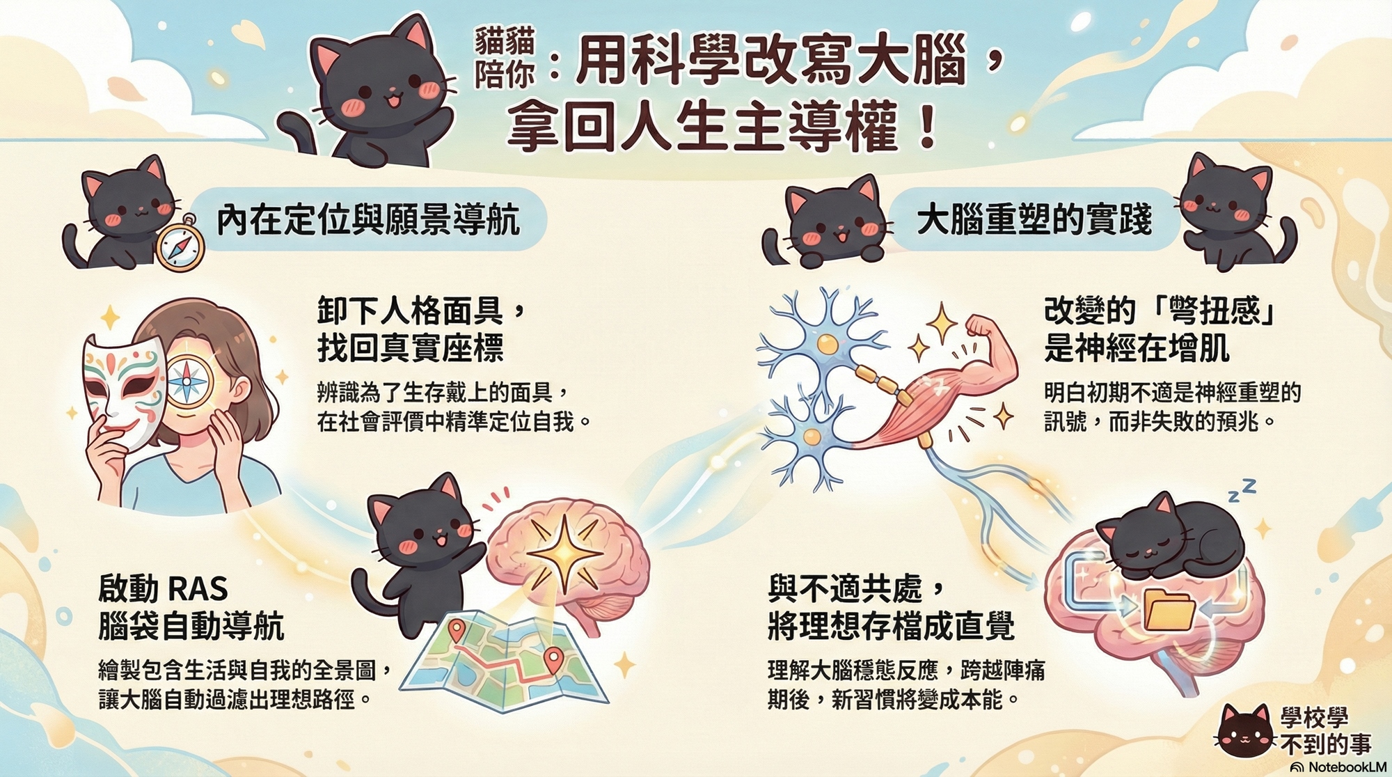 理解 赫布定律 (Hebbian Theory) 與 穩態 (Homeostasis) 反應。我們會告訴你,改變初期的「彆扭感」不是失敗,而是大腦神經正在「增肌」的訊號。學會與不適感共處,你才能真正將理想版本存檔,變成本能。