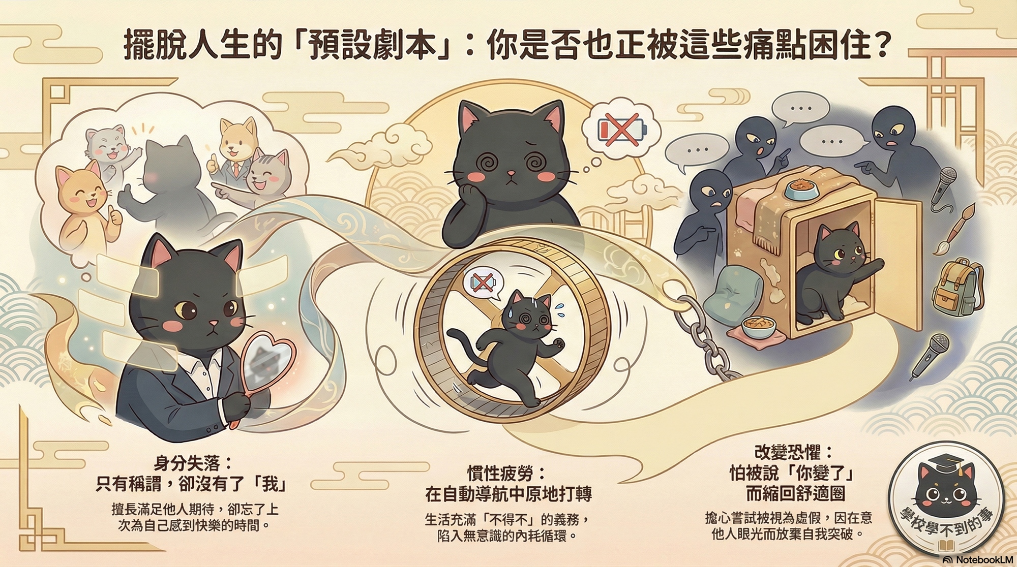 我們搭著同樣的捷運,走進同樣的辦公大樓,在會議室裡戴上專業的面具,在家庭聚餐裡扮演乖巧的孩子或盡責的父母。回到家,滑著手機看著別人的精采生活,心裡卻總有個微弱的聲音在問:「這真的就是我想要的人生嗎?」